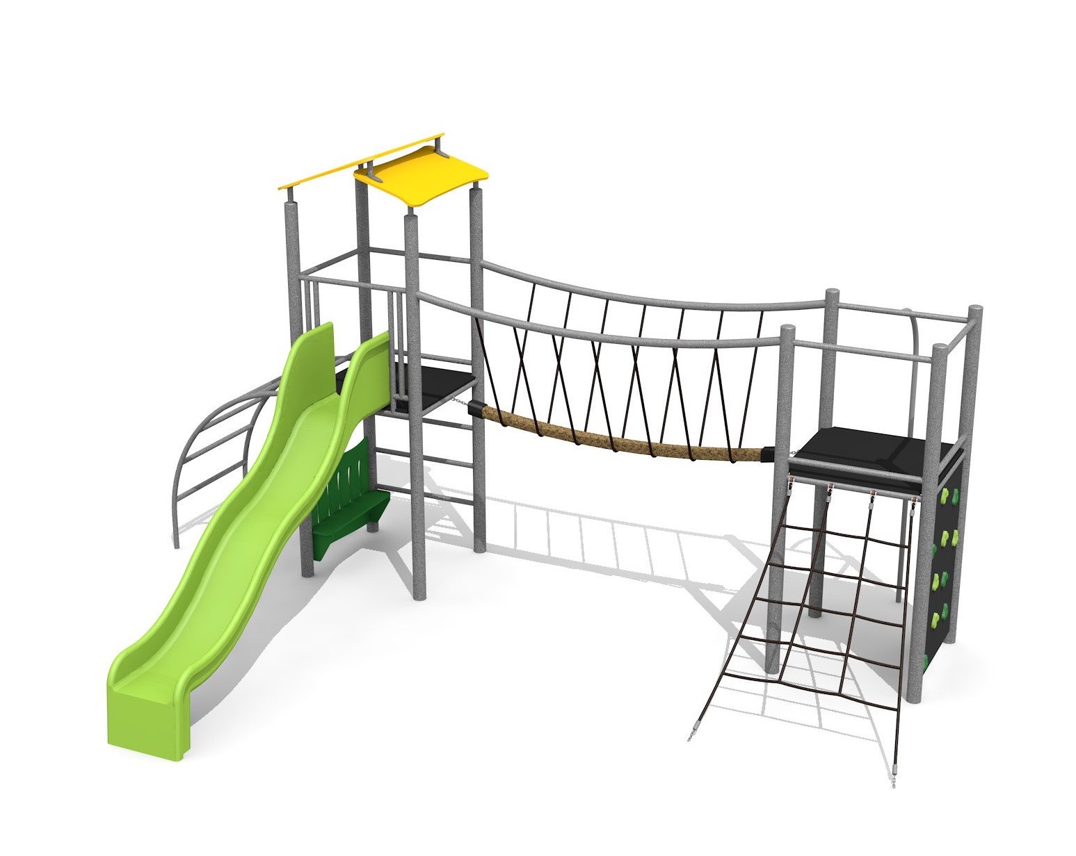 Construction solide en acier galvanisé, panneaux en matière synthétique résistant aux intempéries, combinaison de couleur, jaune-vert ou sur demande. Toboggan en polyester. Cordes armées en acier.