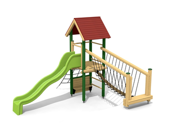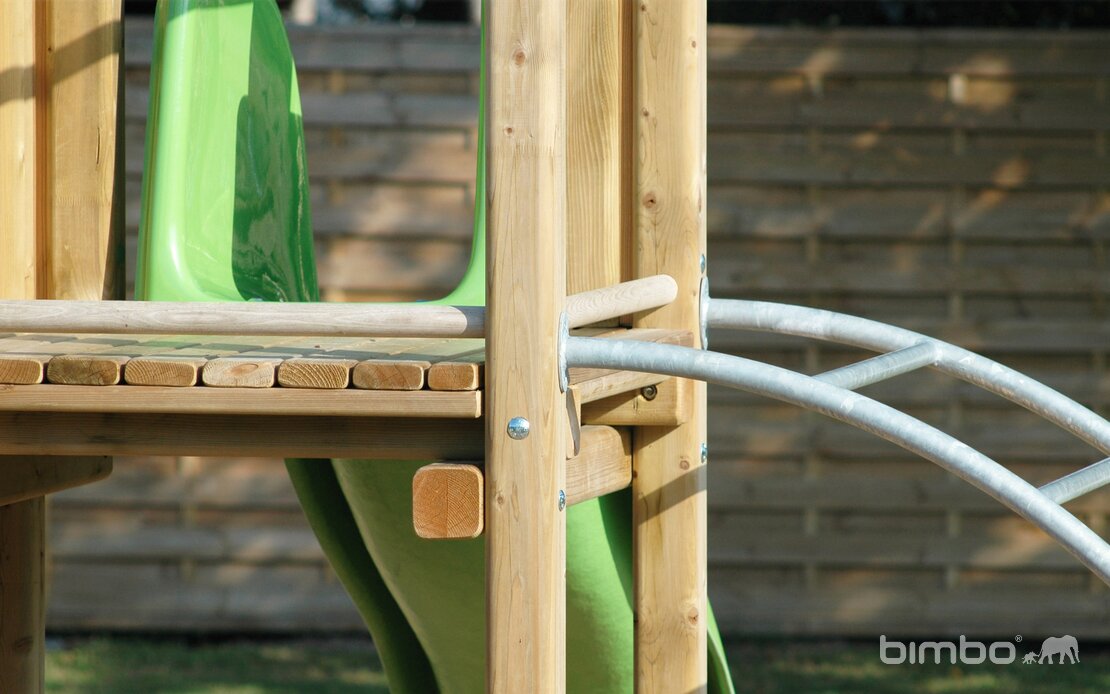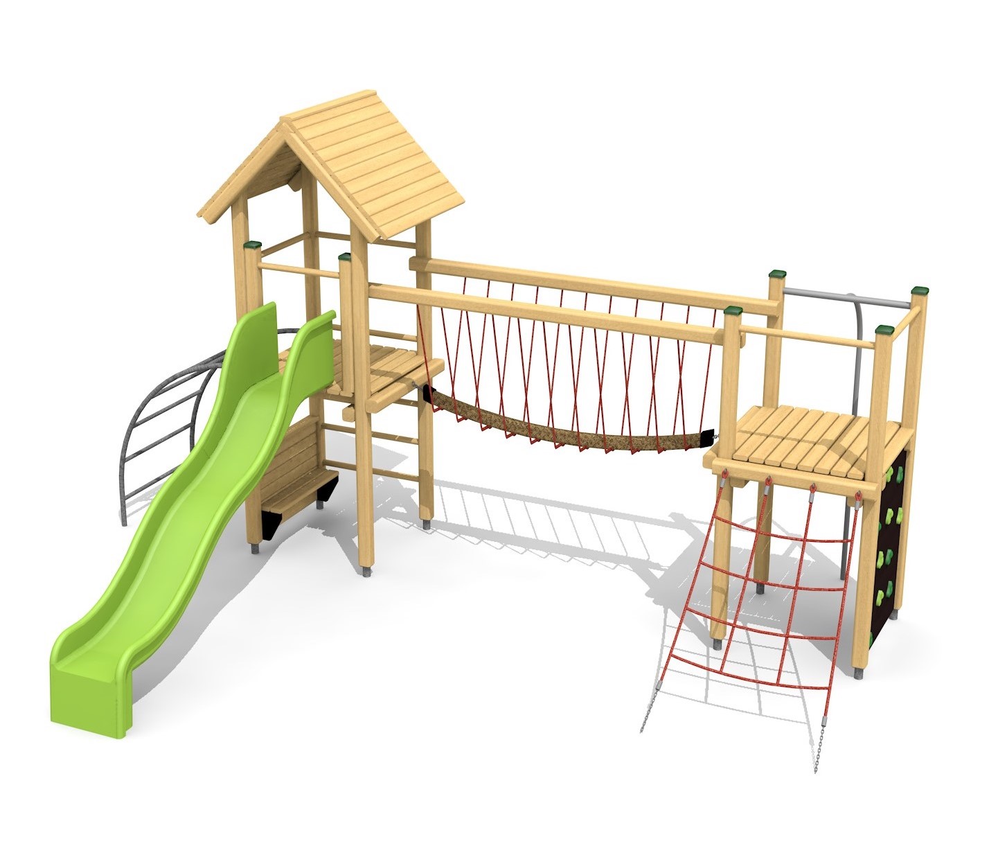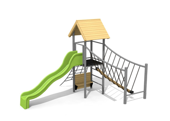 Bois résineux massif. Socle en métal zingué à chaud inclus. Toboggan en polyester. Cordes armées en acier.