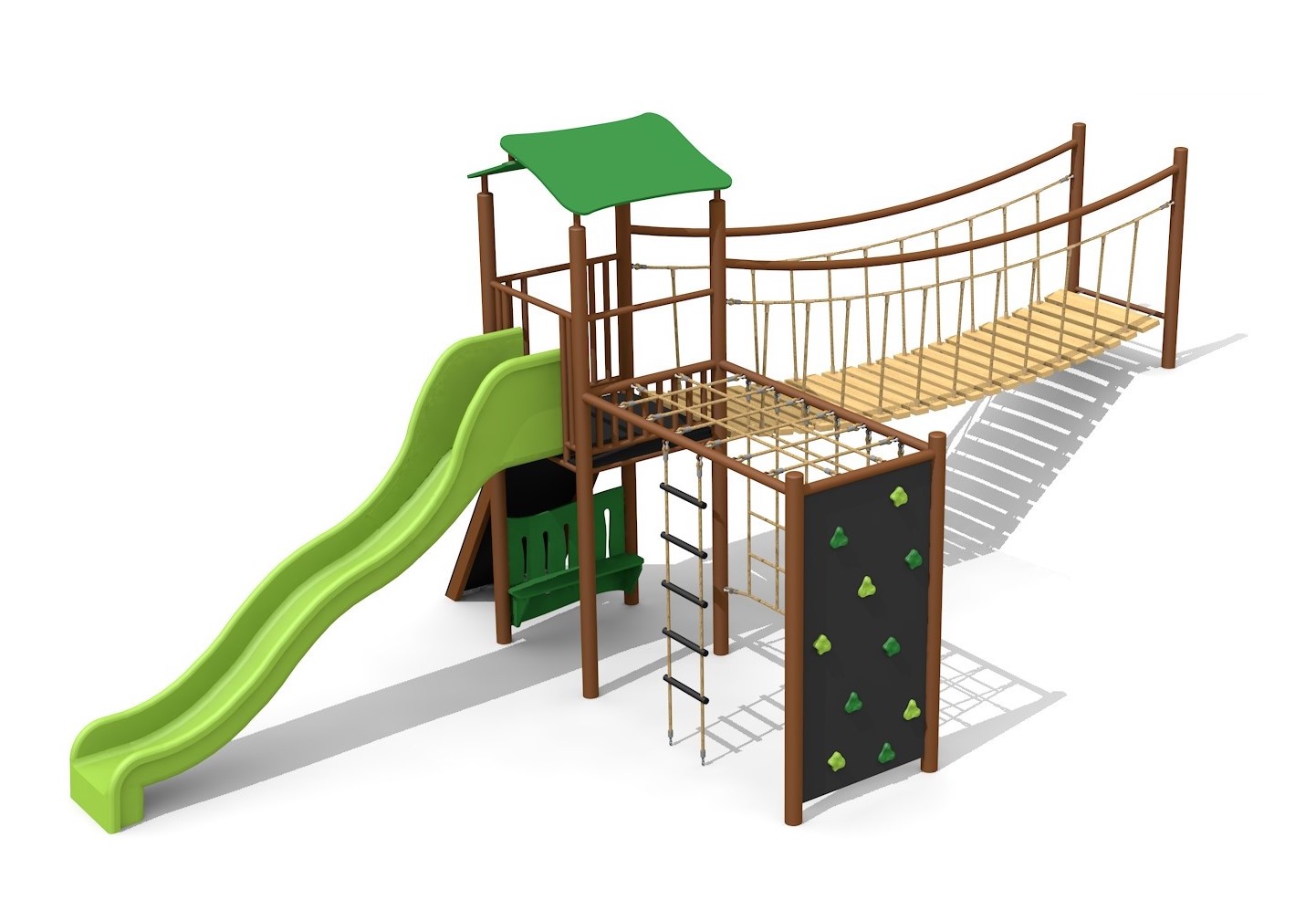 Construction solide en acier galvanisé et couleur, panneaux en matière synthétique résistant aux intempéries, combinaison de couleur, brun-vert ou sur demande. Toboggan en polyester. Cordes armées en acier.