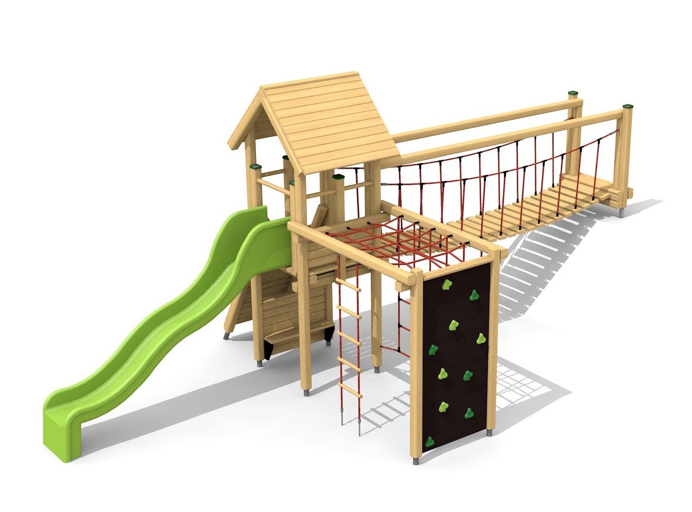 Bois résineux massif. Socle en métal zingué à chaud inclus. Toboggan en polyester. Cordes armées en acier.