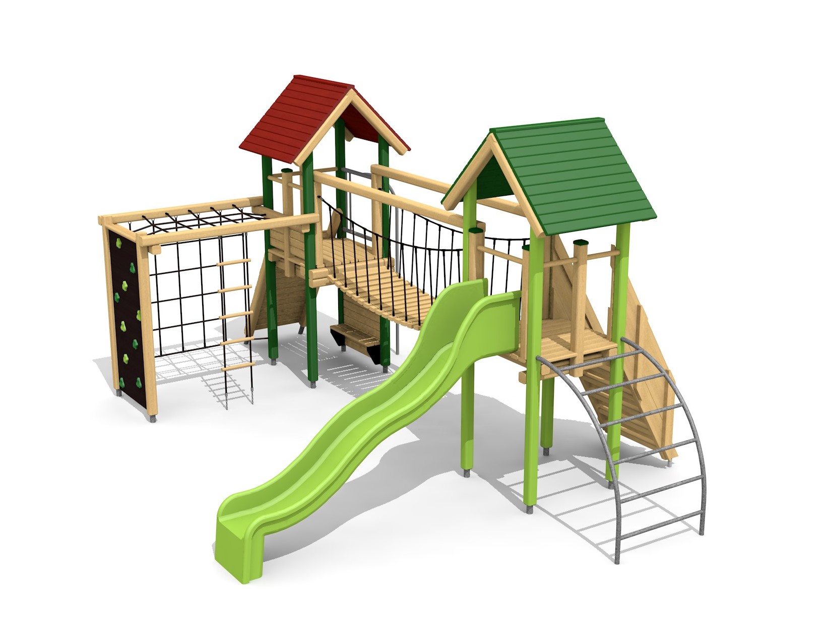 Bois résineux massif, lasurée en couleur. Socle en métal zingué à chaud inclus. Toboggan en polyester. Cordes armées en acier.
