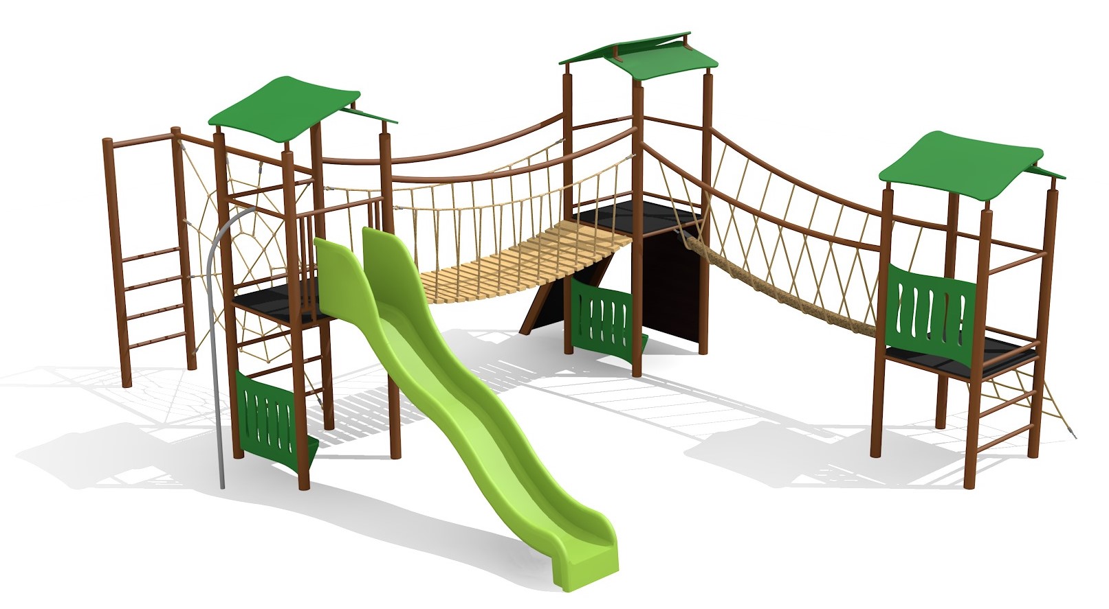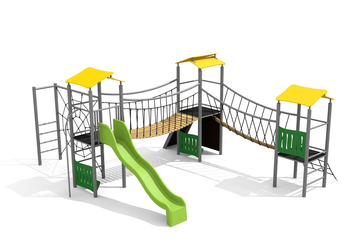 Construction solide en acier galvanisé et couleur, panneaux en matière synthétique résistant aux intempéries, combinaison de couleur, brun-vert ou sur demande. Toboggan en polyester. Cordes armées en acier.