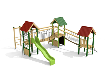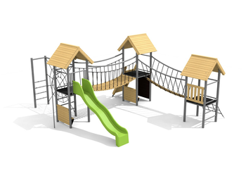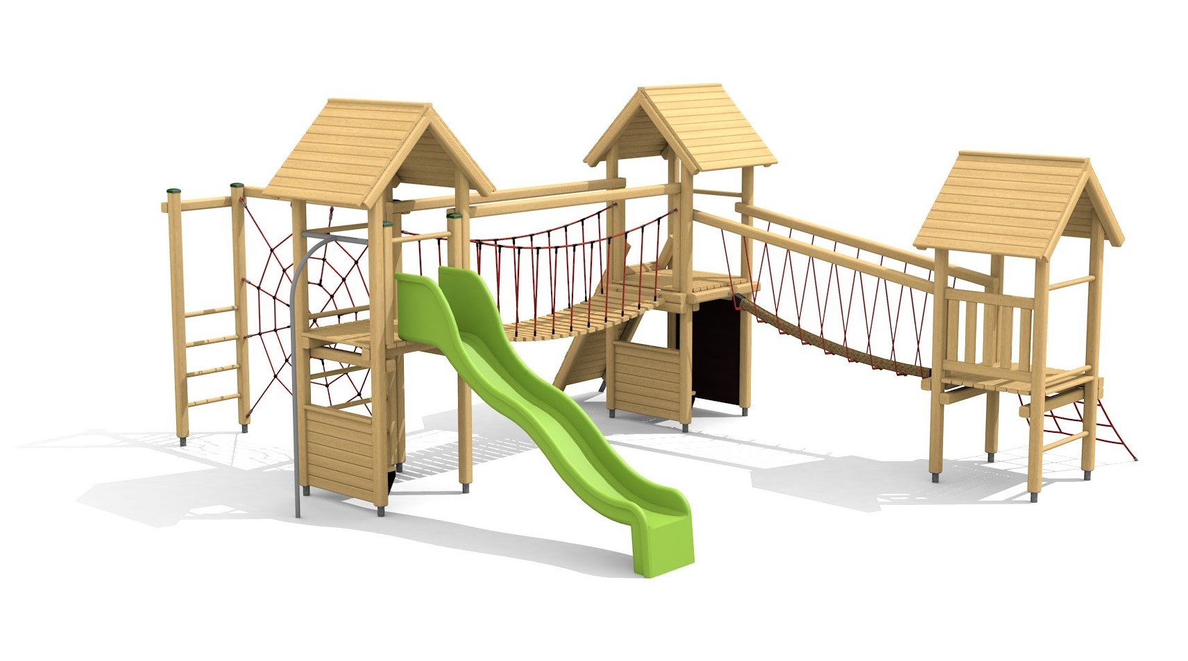 Bois résineux massif. Socle en métal zingué à chaud inclus. Toboggan en polyester. Cordes armées en acier.