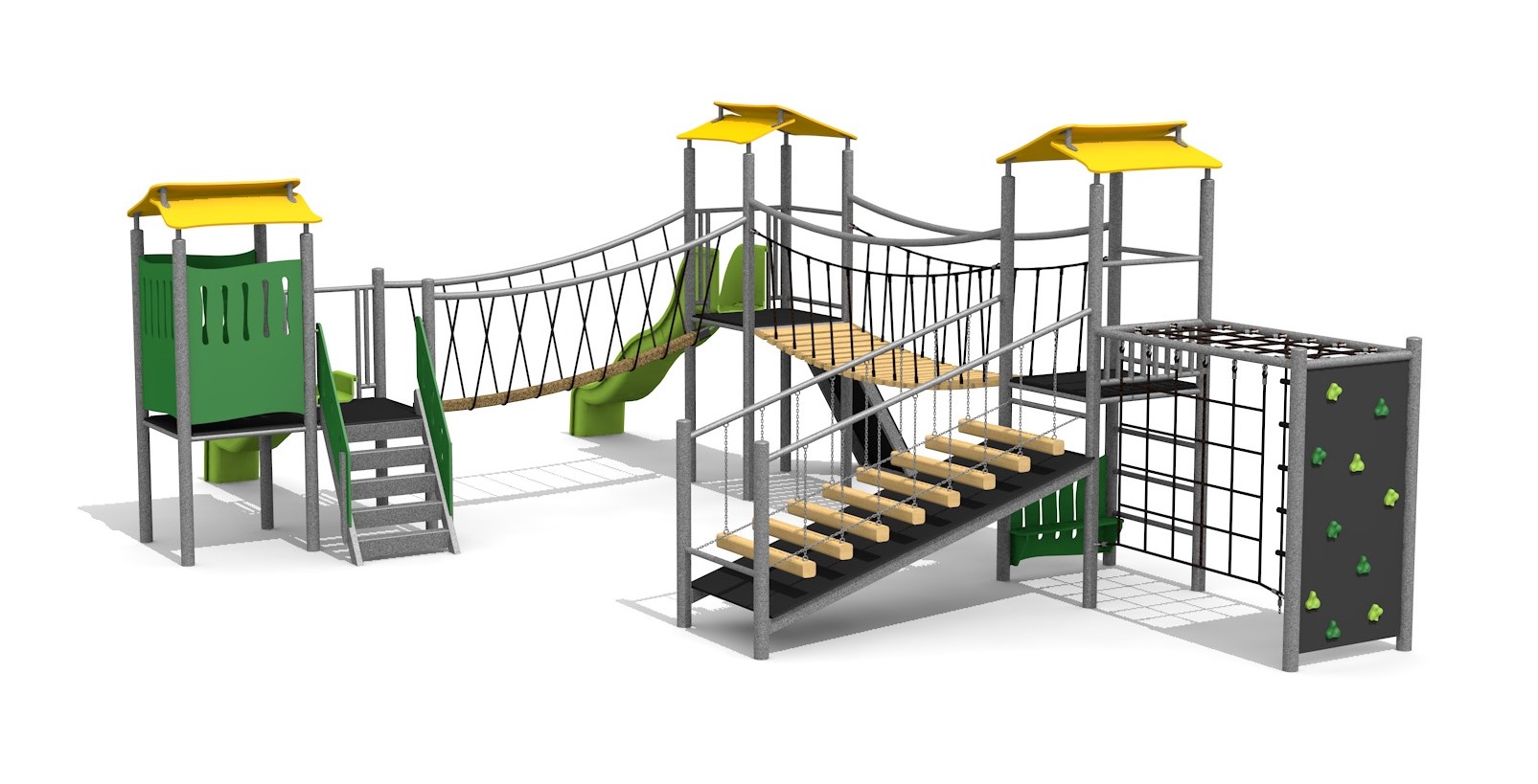Construction solide en acier galvanisé, panneaux en matière synthétique résistant aux intempéries, combinaison de couleur, jaune-vert ou sur demande. Toboggan en polyester. Cordes armées en acier.