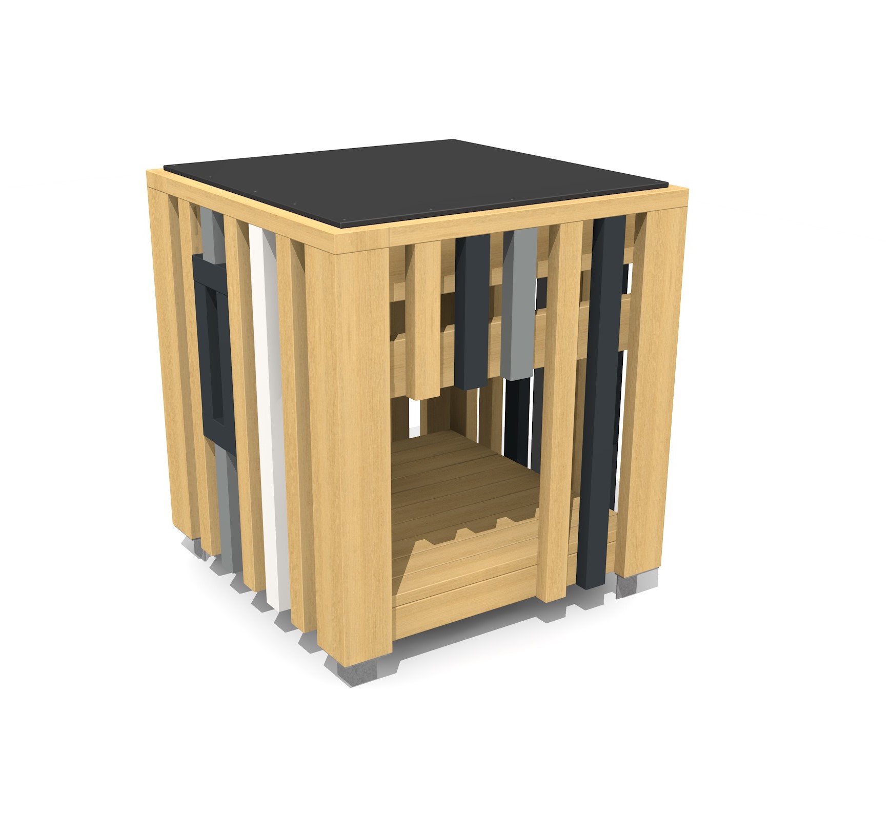 En bois de douglas Suisse. Tous les jeux avec consoles en acier galvanisé. Toit en matière synthétique résistante aux intempéries couleur anthracite. Lasuré selon charte de couleur.