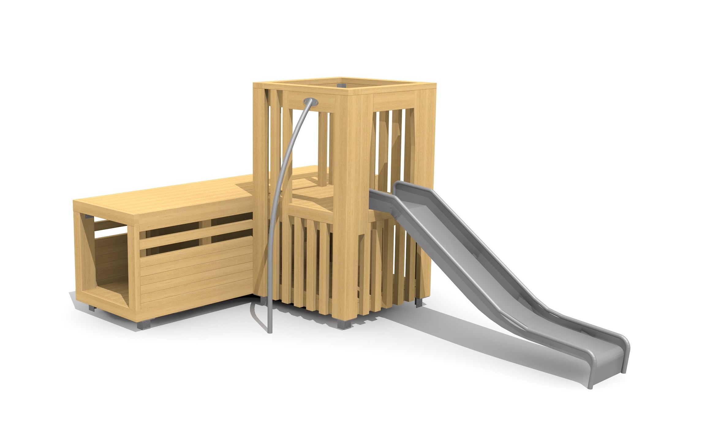 En bois de douglas Suisse, non traité. Tous les jeux avec consoles en acier galvanisé, perche à grimper et toboggan en inox.