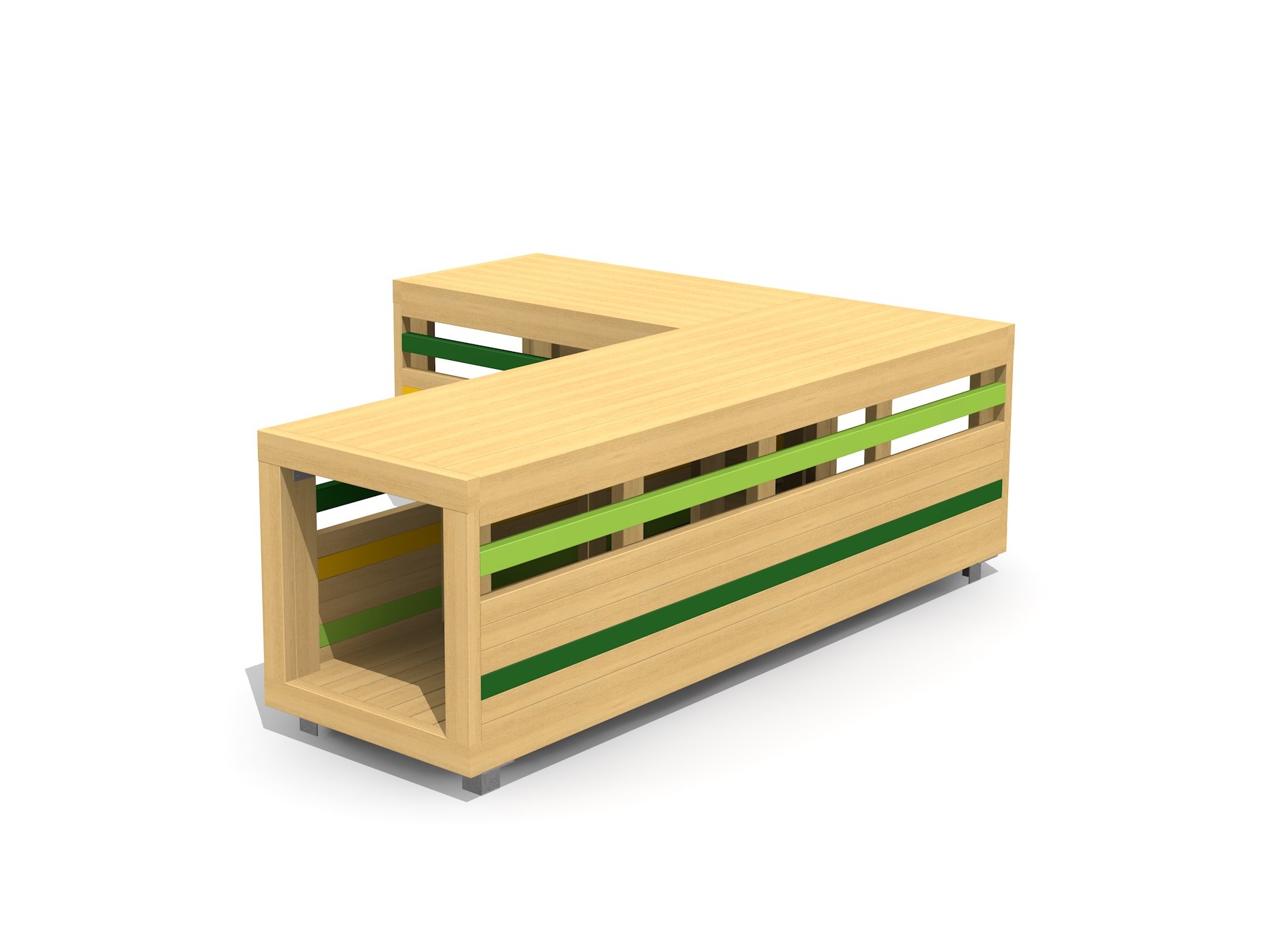 En bois de douglas Suisse, non traité. Tous les jeux avec consoles en acier galvanisé. Lasuré selon charte de couleur.