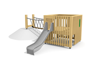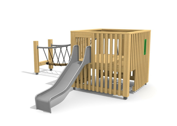 En bois de douglas Suisse, non traité. Tous les jeux avec consoles en acier galvanisé. Toboggan, barres de glisse et pièces d’assemblage en inox.