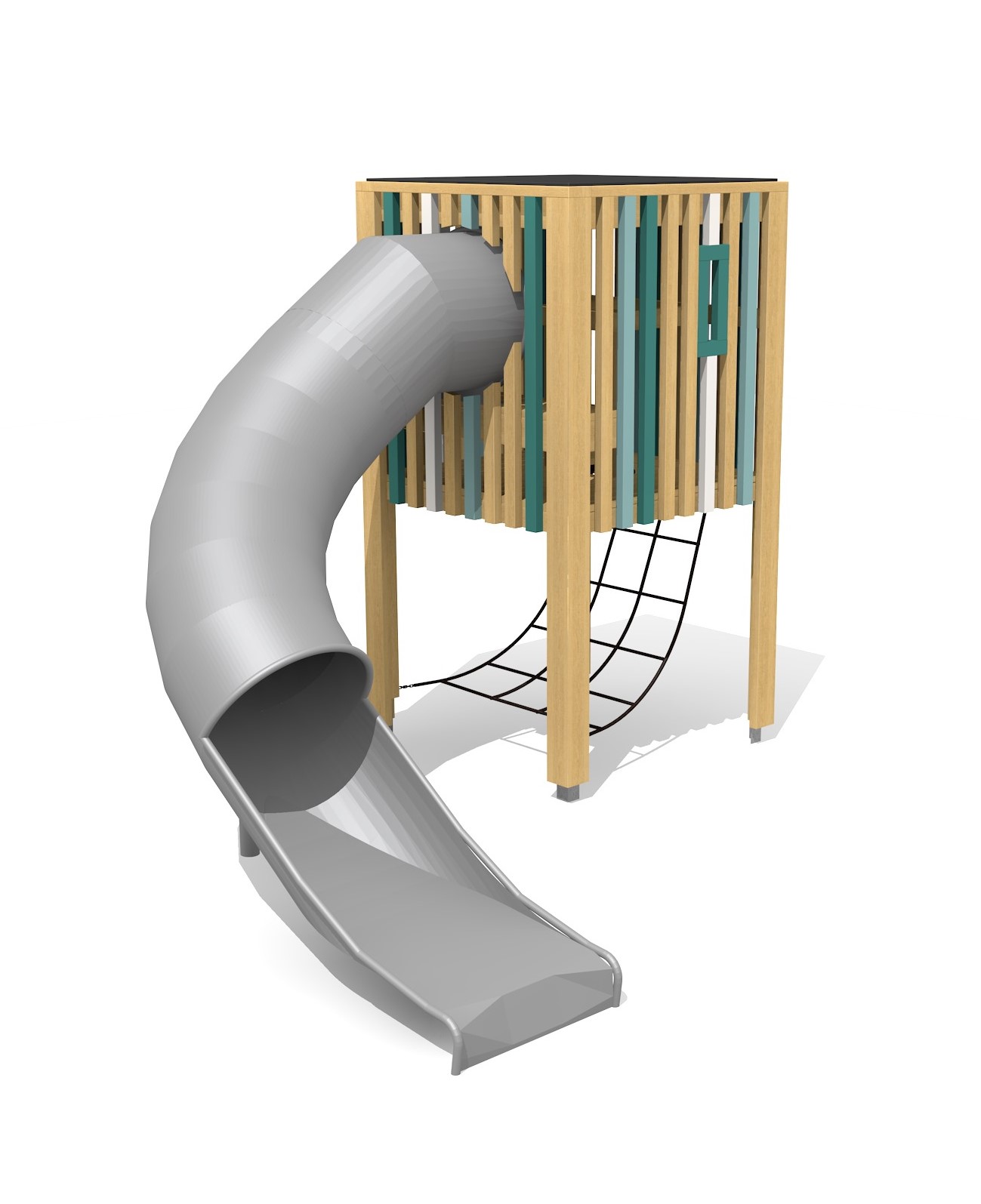 En bois de douglas Suisse. Tous les jeux avec consoles en acier galvanisé. Toit en matière synthétique résistante aux intempéries couleur anthracite. Cordes armées. Toboggan et barres de glisse en inox. Lasuré selon charte de couleur.