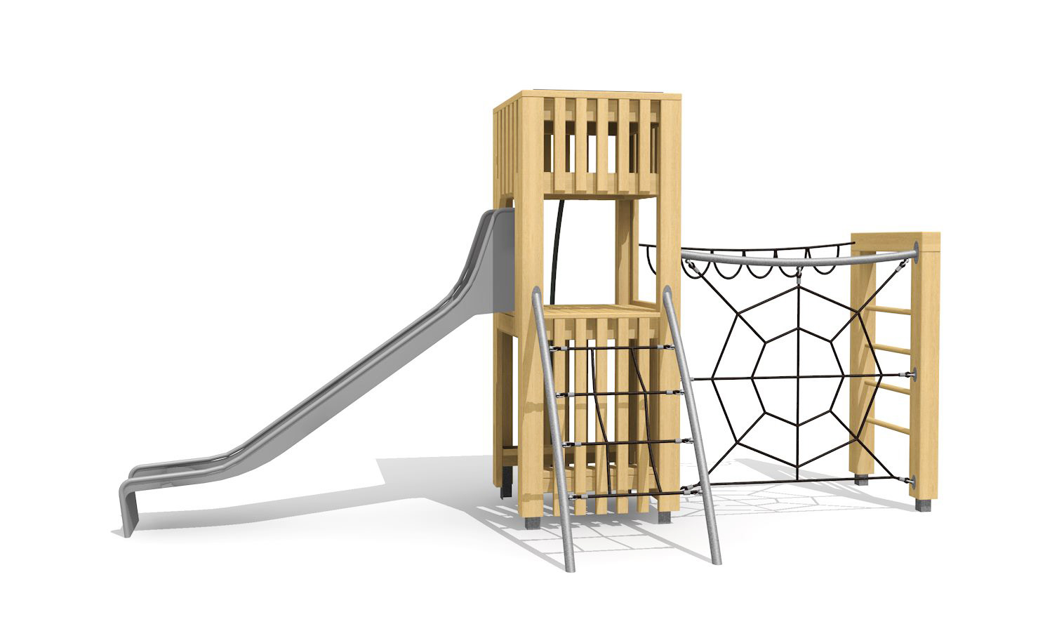 En bois de douglas Suisse, non traité. Tous les jeux avec consoles en acier galvanisé. Toit en matière synthétique résistante aux intempéries couleur anthracite. Cordes armées. Toboggan, barres de glisse et pièces d’assemblage en inox.