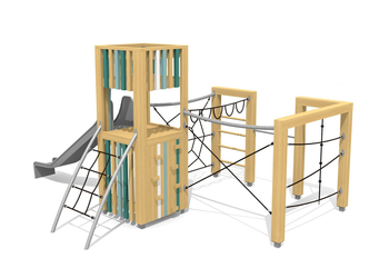 En bois de douglas Suisse, non traité. Tous les jeux avec consoles en acier galvanisé. Toit en matière synthétique résistante aux intempéries couleur anthracite. Cordes armées. Toboggan, barres de glisse et pièces d’assemblage en inox.