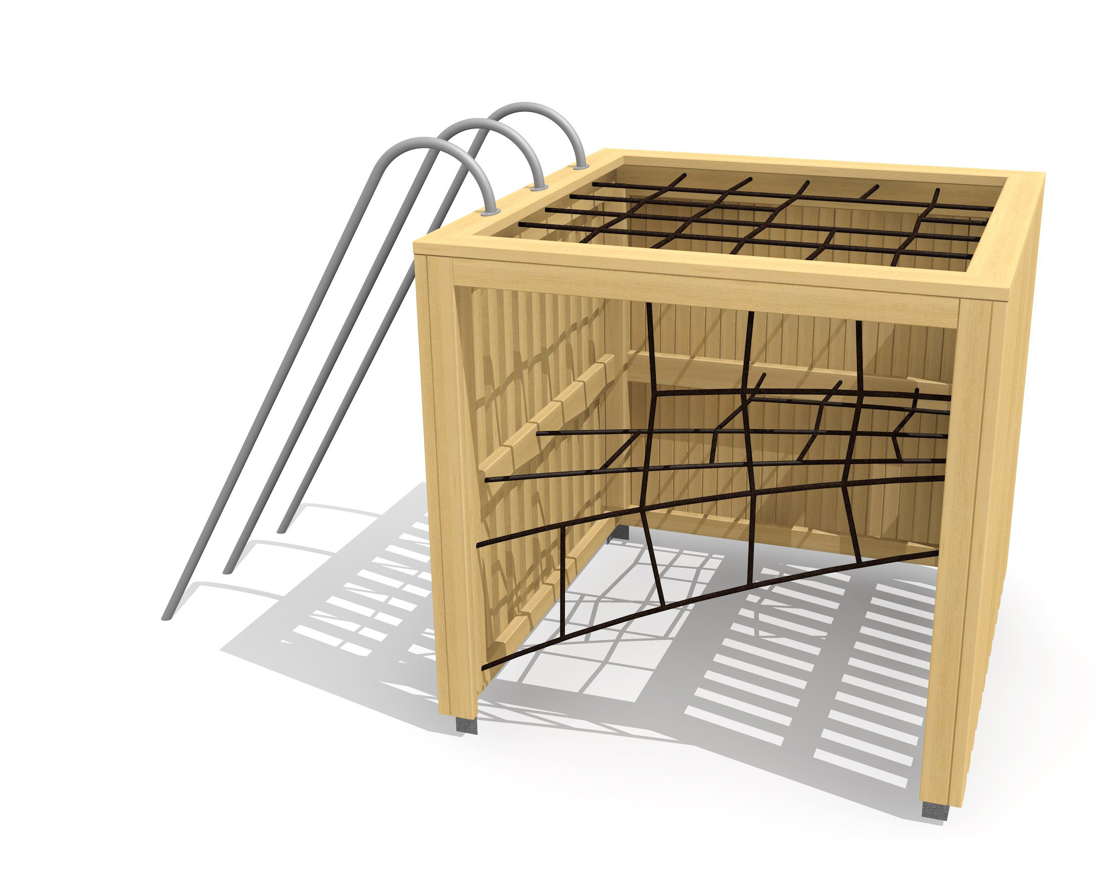 En bois de douglas Suisse, non traité. Tous les jeux avec consoles en acier galvanisé. Cordes armées.