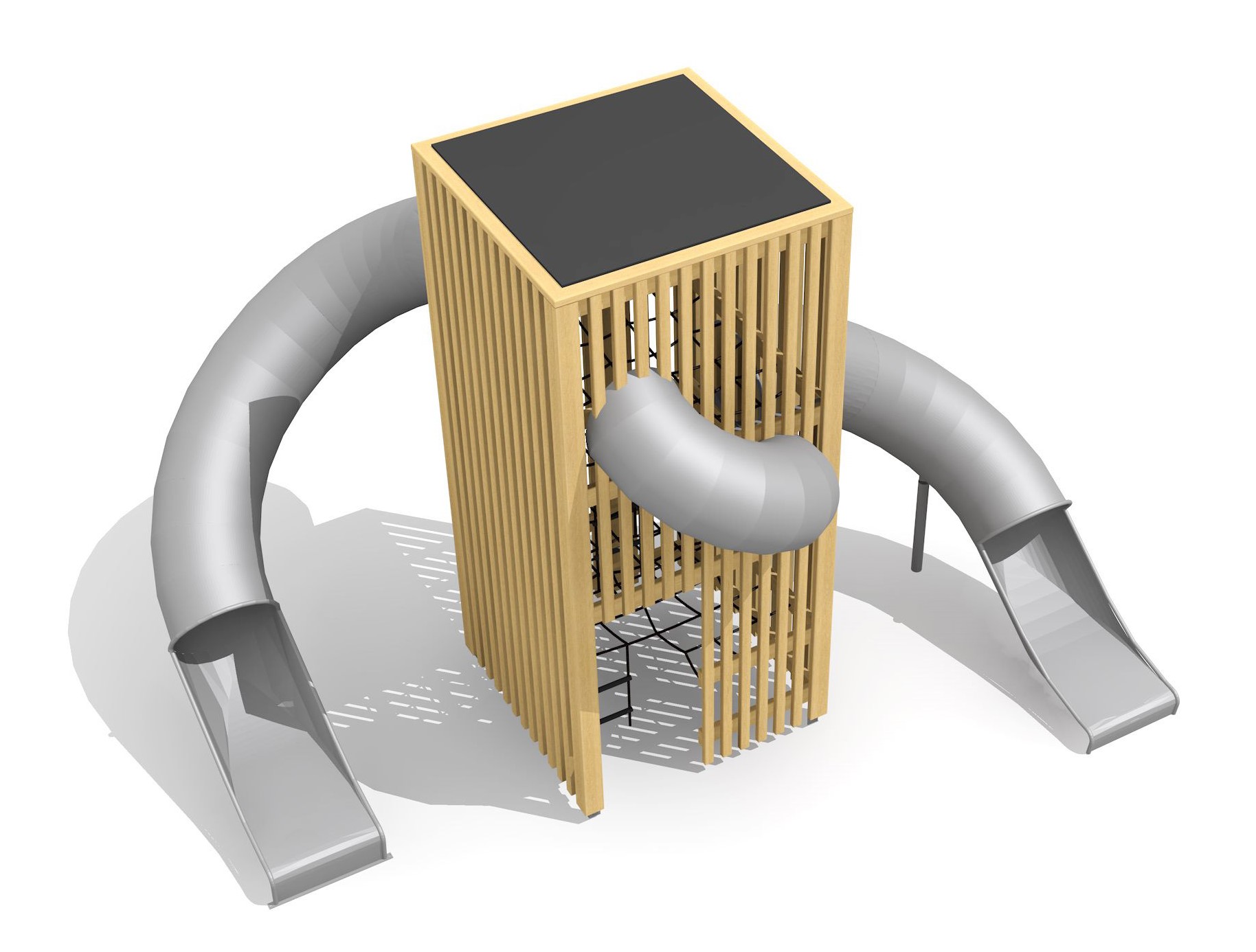 L’ORIGINAL. Les tobogans traversent la tour comme des vers. Tours fermées avec montée sûre en filets et cordes.