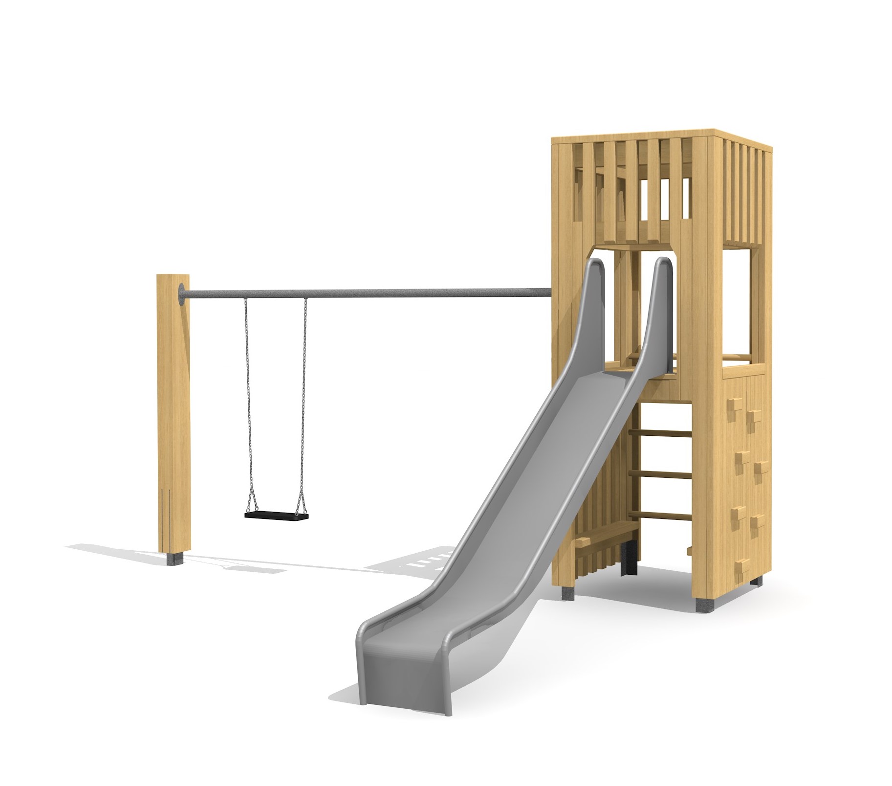 En bois de douglas Suisse, non traité. Tous les jeux avec consoles en acier galvanisé. Toit en matière synthétique résistante aux intempéries couleur anthracite. Toboggan, barres de glisse et pièces d’assemblage en inox.