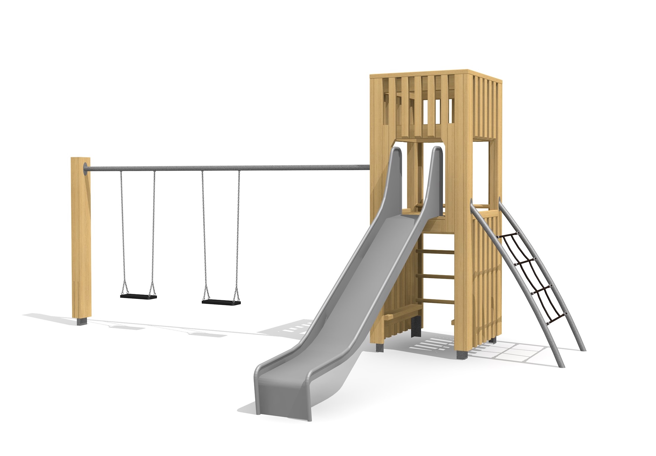 En bois de douglas Suisse, non traité. Tous les jeux avec consoles en acier galvanisé. Toit en matière synthétique résistante aux intempéries couleur anthracite. Cordes armées. Toboggan, barres de glisse et pièces d’assemblage en inox.