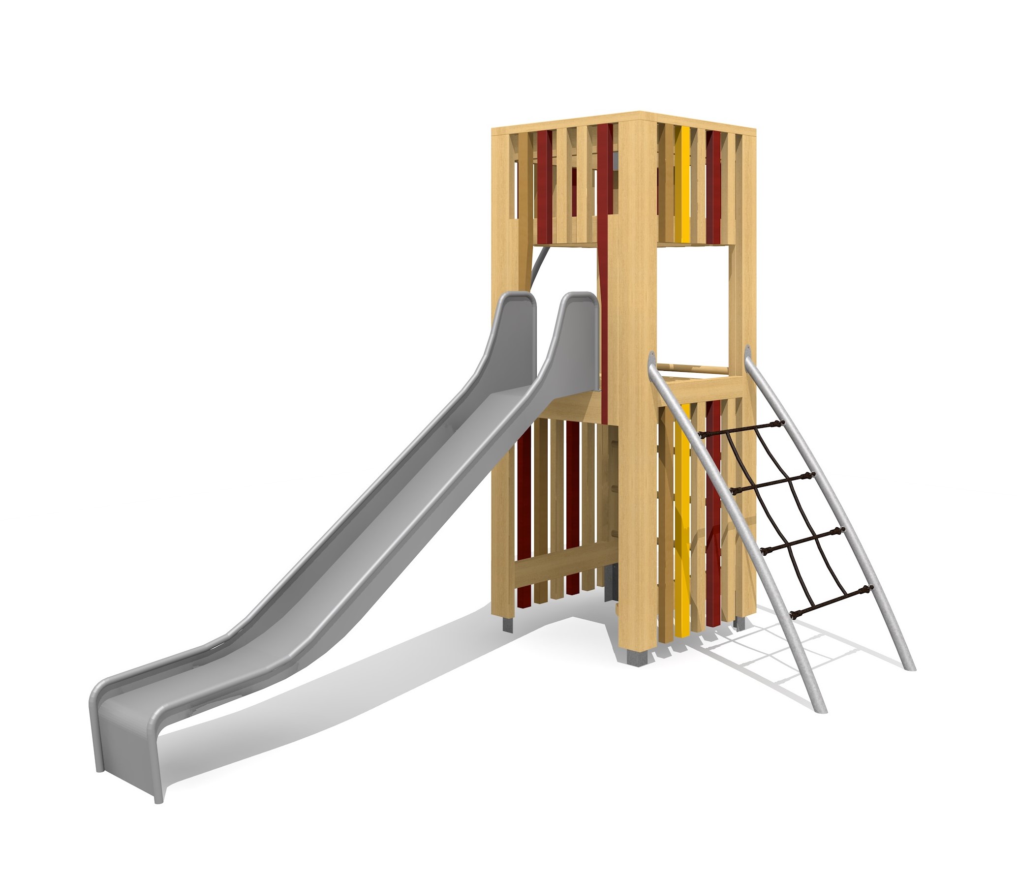 En bois de douglas Suisse. Tous les jeux avec consoles en acier galvanisé. Toit en matière synthétique résistante aux intempéries couleur anthracite. Cordes armées. Toboggan et barres de glisse en inox. Lasuré selon charte de couleur.