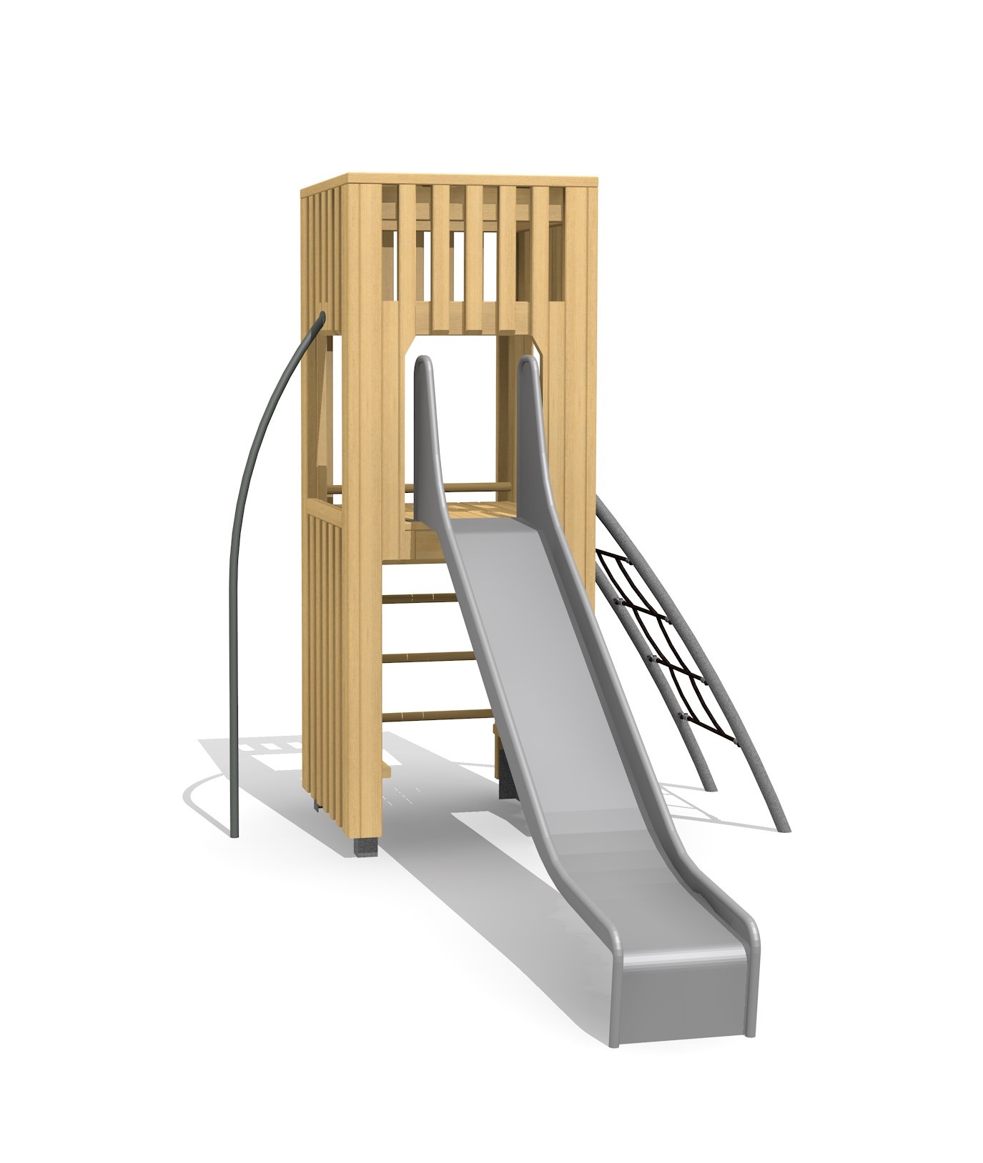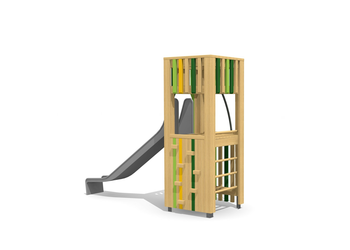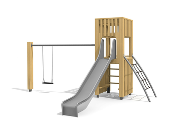 En bois de douglas Suisse, non traité. Tous les jeux avec consoles en acier galvanisé. Toit en matière synthétique résistante aux intempéries couleur anthracite. Cordes armées. Toboggan, barres de glisse et pièces d’assemblage en inox.