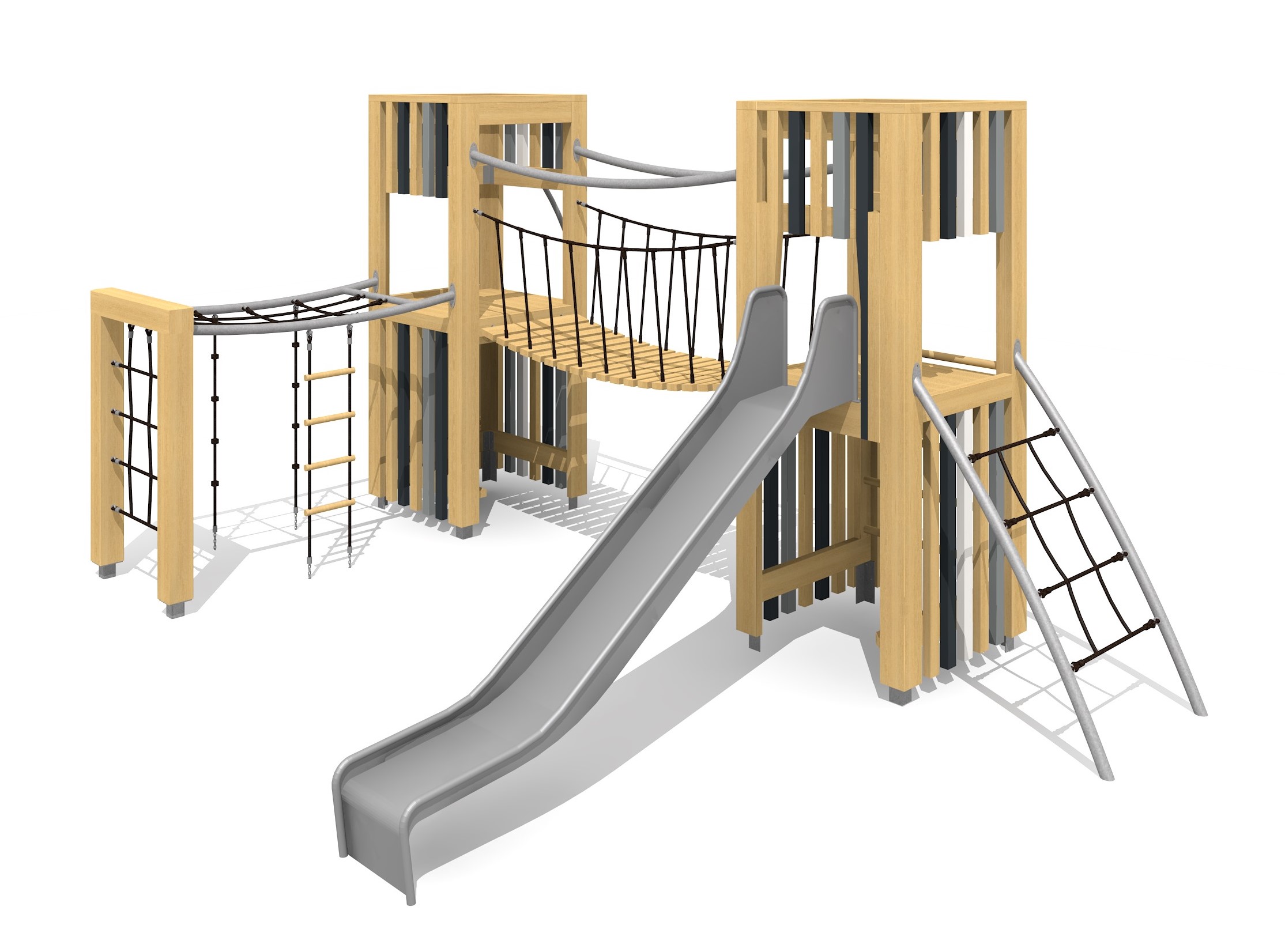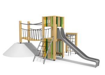 En bois de douglas Suisse. Tous les jeux avec consoles en acier galvanisé. Toit en matière synthétique résistante aux intempéries couleur anthracite. Cordes armées. Toboggan et barres de glisse en inox. Lasuré selon charte de couleur.