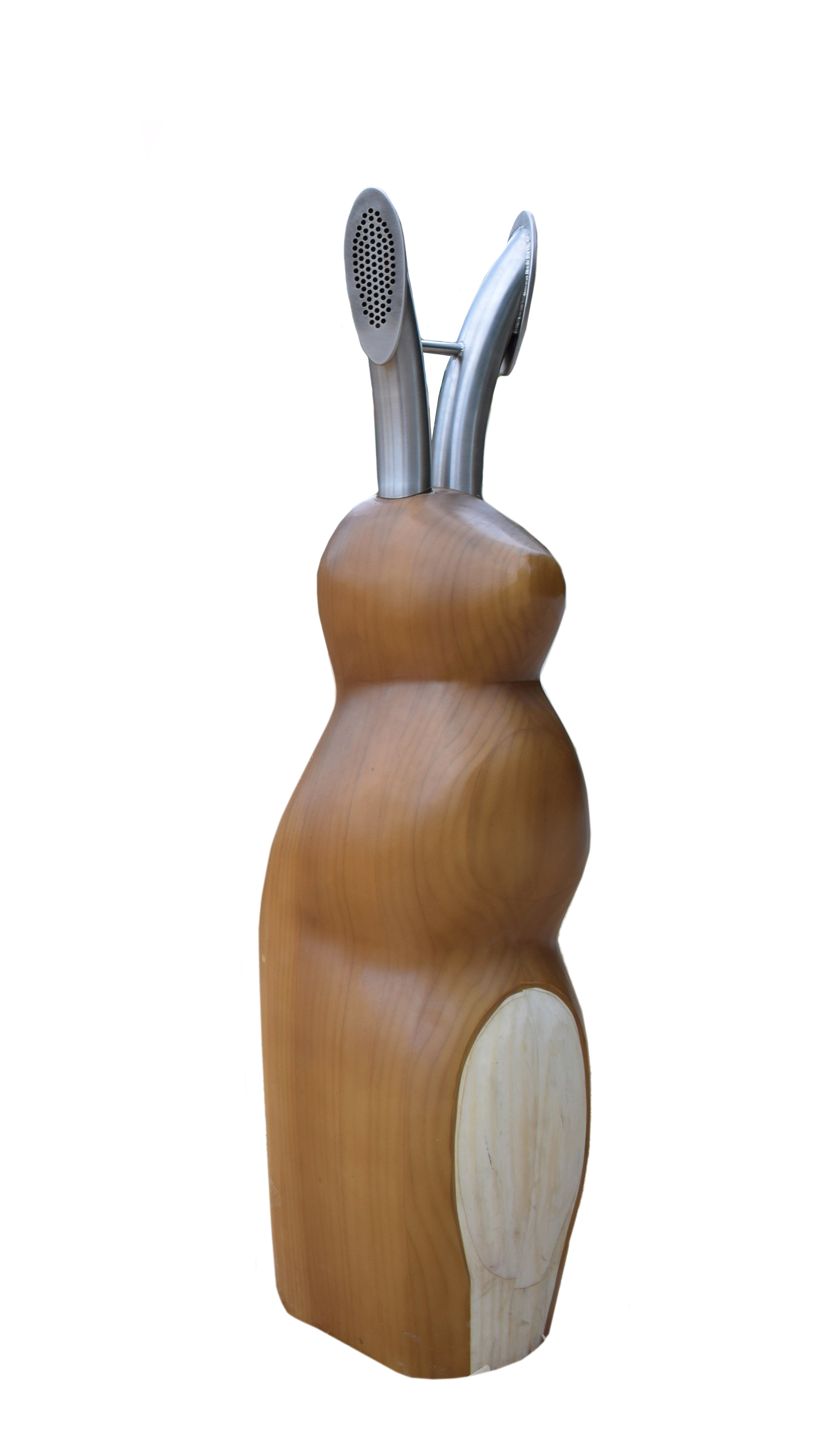 Figures en bois massif, sculptées main. Tuyau cintré en inox. Entonnoir en i nox, anti-saletés.