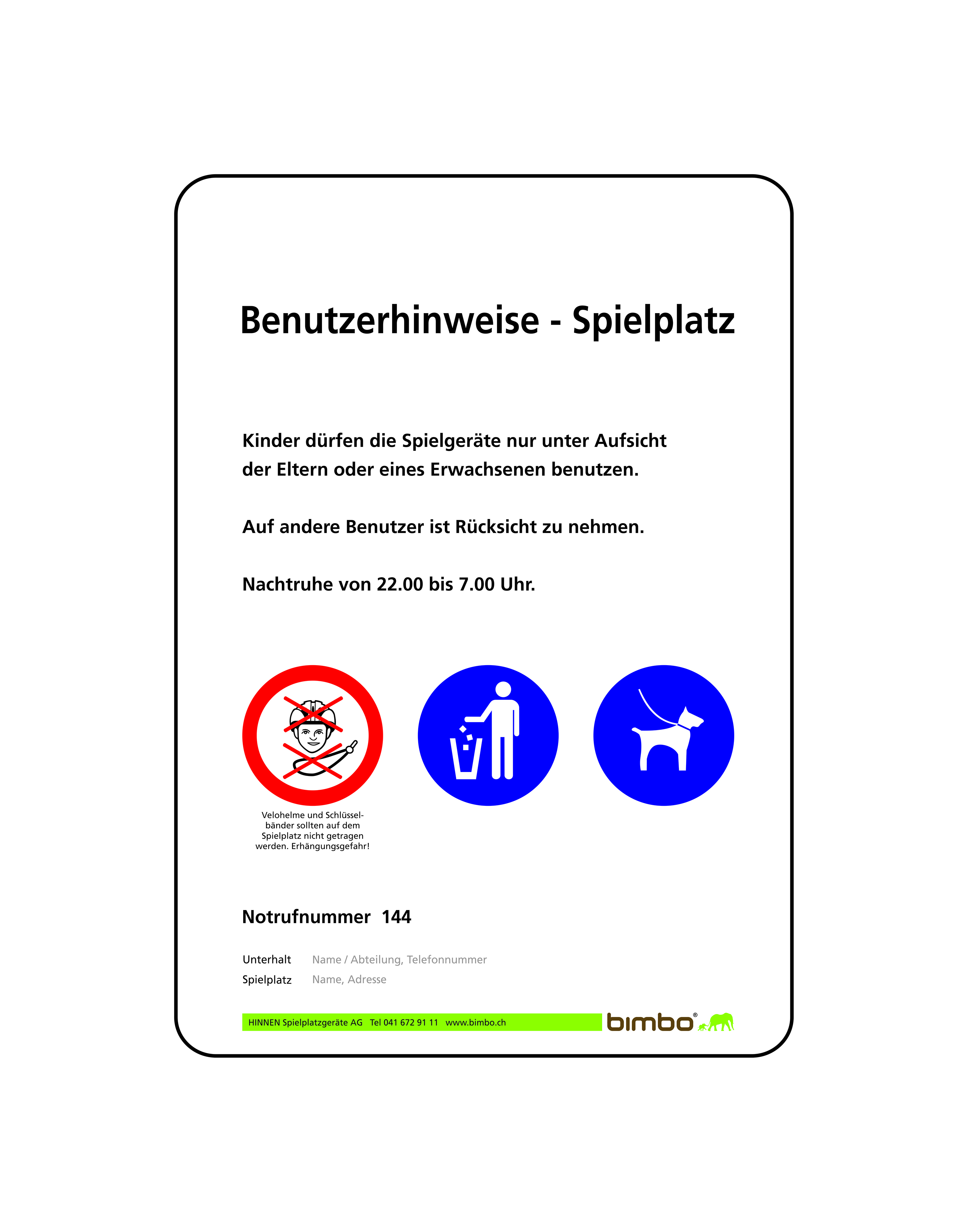 Les panneaux d'information sont exigés par la norme de sécurité SN EN 1176 pour les aires de jeux accessibles. Différentes données doivent obligatoirement y figurer.