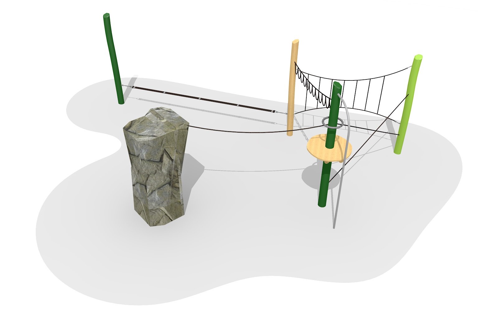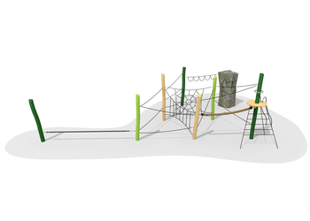 Standard: Couleur granit, difficile à grimper. Poteaux en bois de robinier massif, croissance naturelle, barres en inox et cordes armées 6 brins, couleur standard rouge ou à choix. Surface du bois lasurée écologiquement.