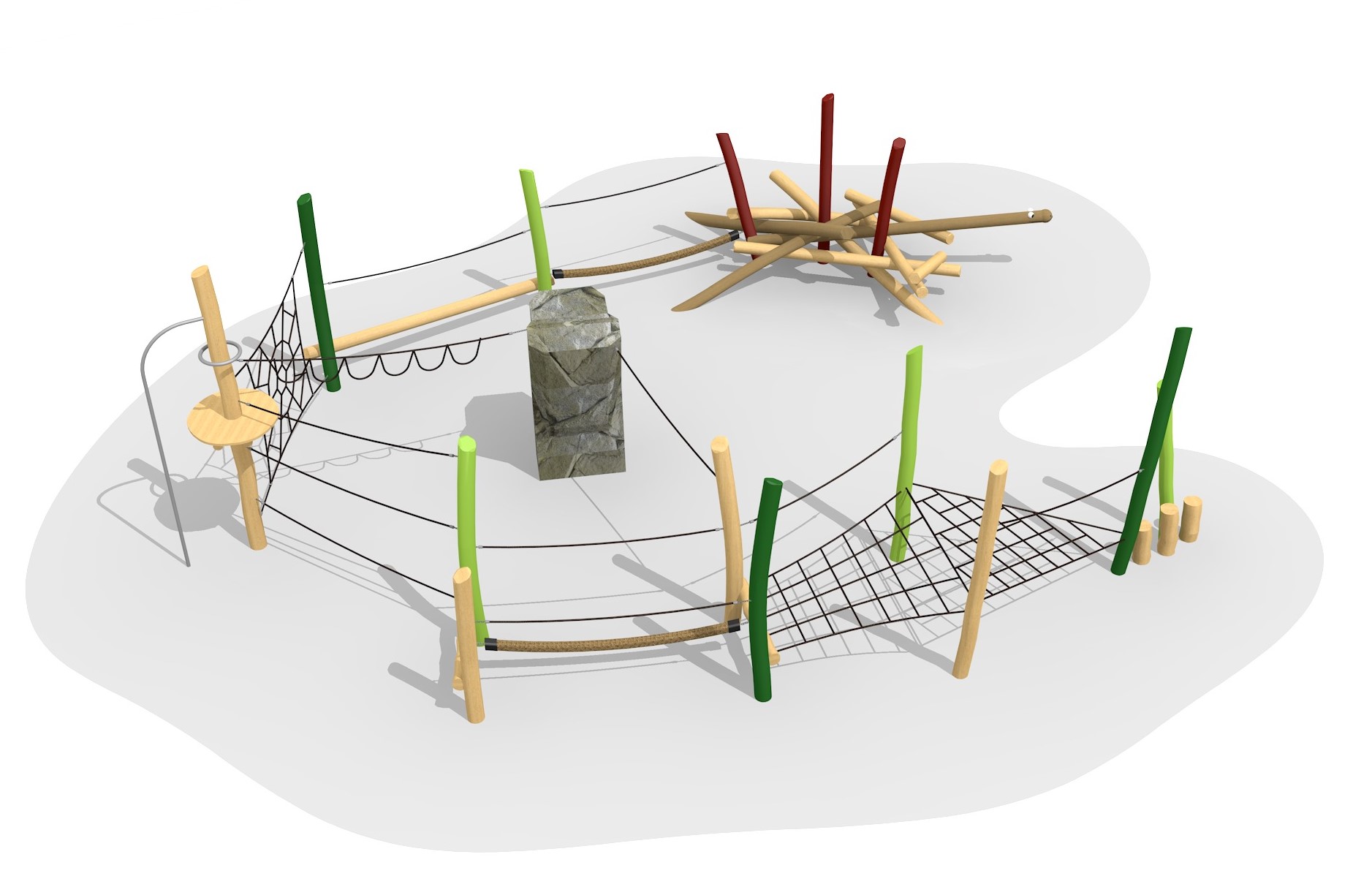 Standard: Couleur granit, difficile à grimper. Poteaux en bois de robinier massif, croissance naturelle, barres en inox et cordes