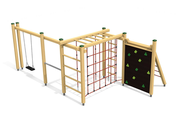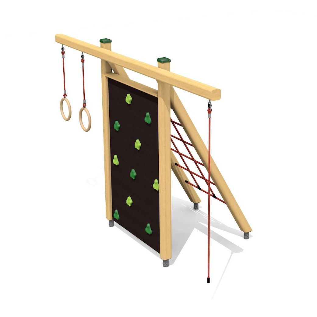 Supports en bois résineux massif avec pieds en métal zingué à chaud. Pièce en métal zingué à chaud. Toile d’araignée en cordes armées.