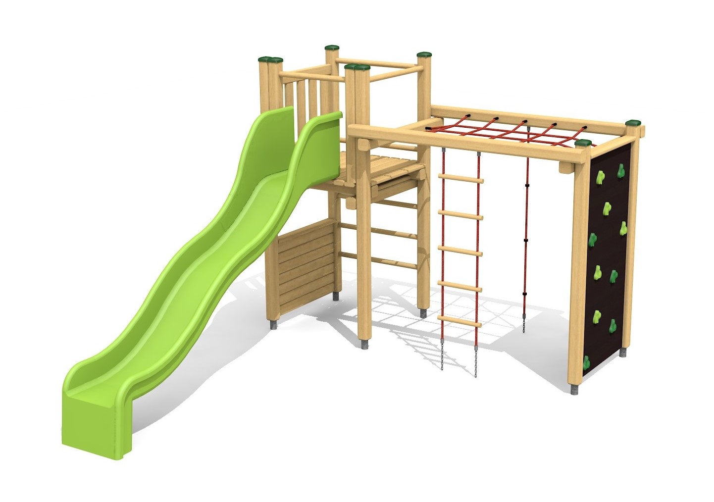 Armature en bois résineux massif avec pieds en métal zingués à chaud. Echelons en bois dur. Cordes et filets en Hercules armés en acier. Toboggan en GFK en vert clair.