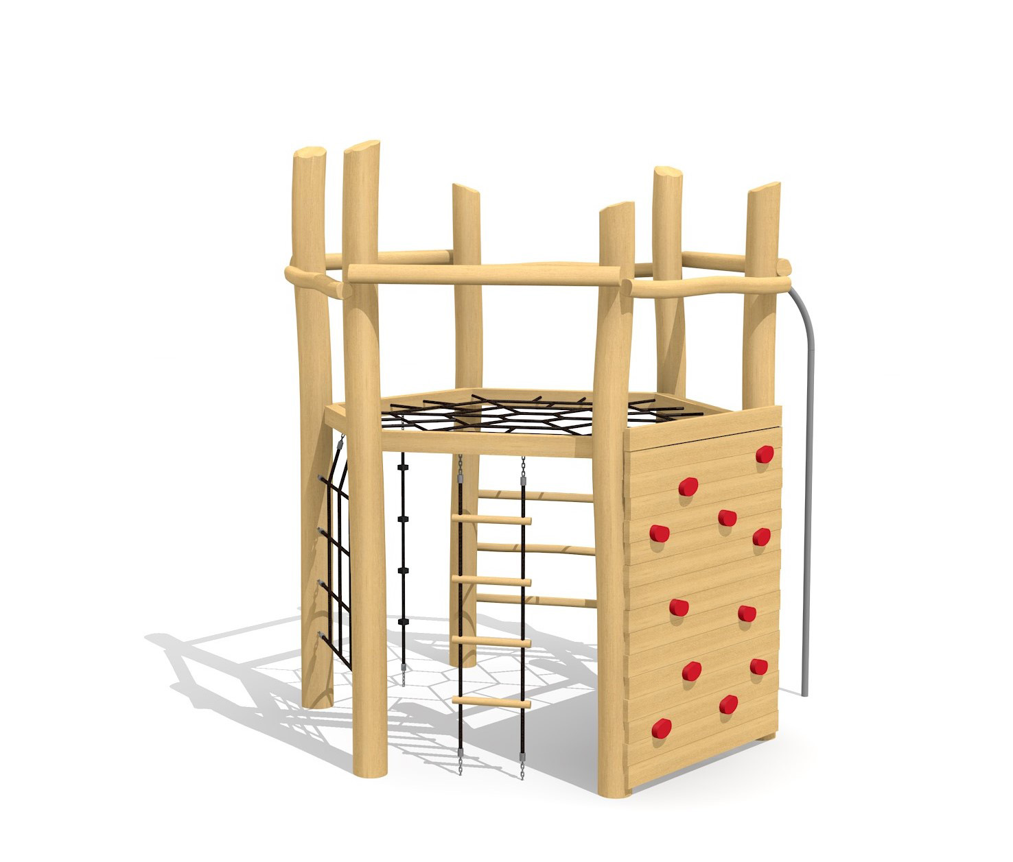 Armature en bois de robinier massif, croissance naturelle, non traité. Echelons en bois dur. Cordes et filets armés. Toboggan en GFK.