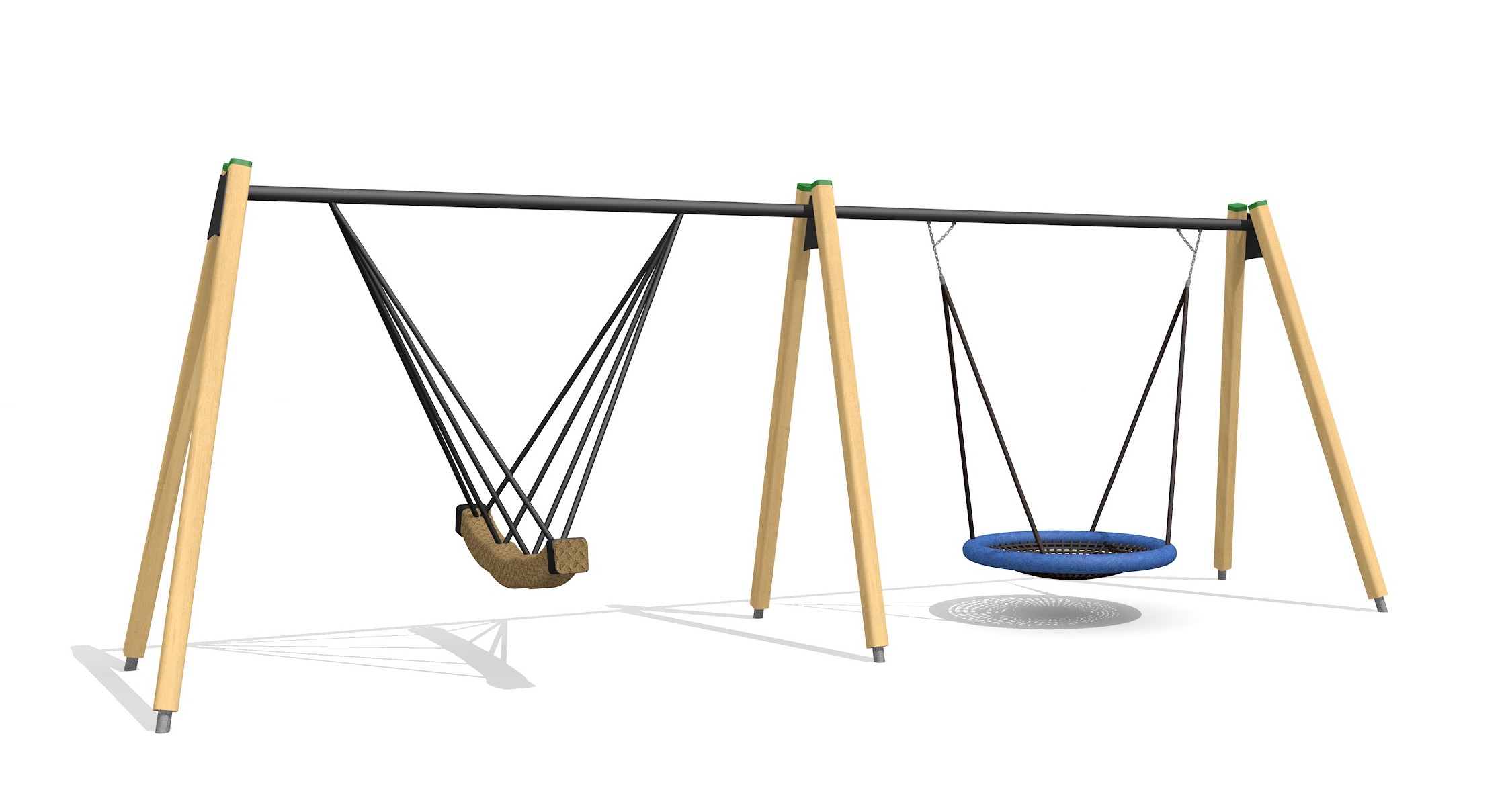 Corde en PP Ø 16 cm, suspensions noires et roulements sans graissage. Nid d’oiseau avec sécurité antichute. En bois de sapin blanc imprégné, socle en métal inclus. Traverses en métal zinguées et laquées.