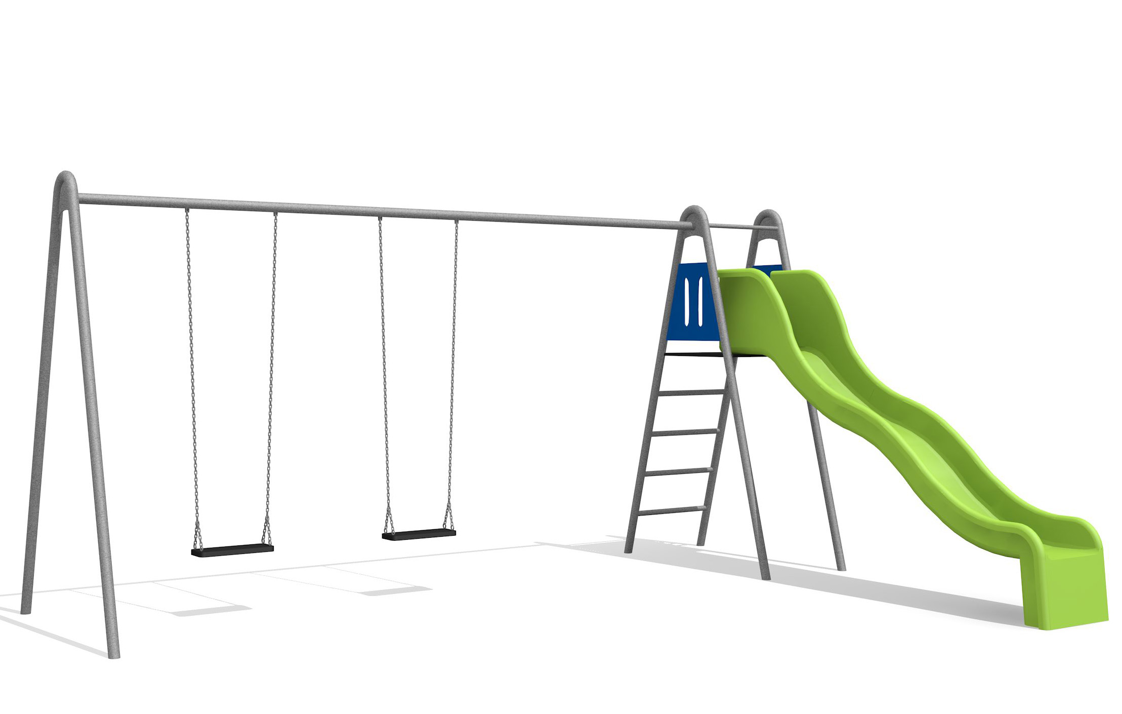 Armature en tube de métal zingué à chaud. Suspension bimbo sans graissage. Siège de sécurité avec noyau métallique et chaînes en inox. Toboggan ondulé en polyester vert ou rouge.