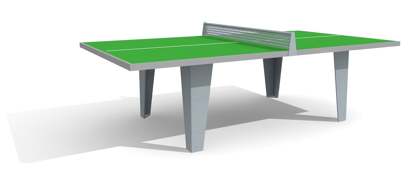 Plateaux solides en béton polymère avec un cadre aluminium, épaisseur 45 mm. Marquage inclus. Les dessus sont disponibles en vert. Socle en métal zinquée.