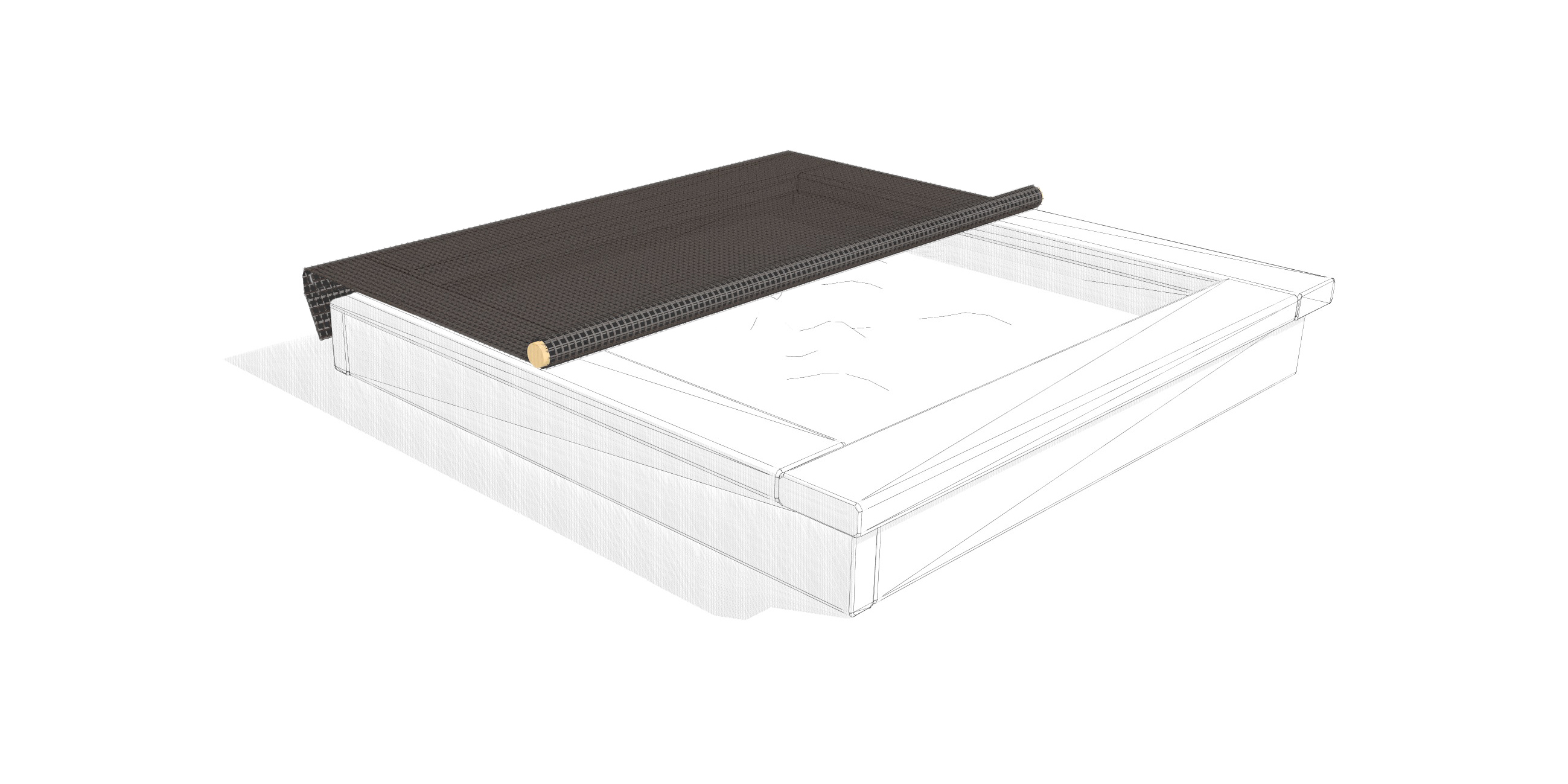 Dans la mesure du possible, les bacs à sable devraient être couverts. Une barre permet de la rouler et de la dérouler facilement. Il est également possible de tendre la bâche avec un élastique de caoutchouc fixé sur des rouleaux de fixation.