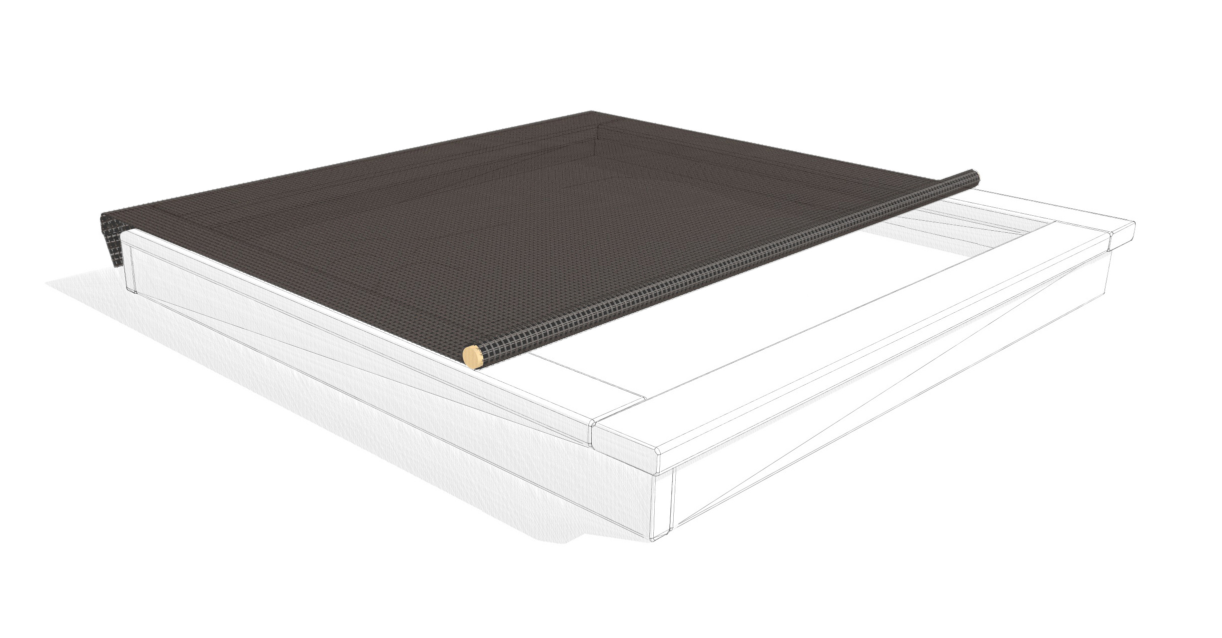 Dans la mesure du possible, les bacs à sable devraient être couverts. Une barre permet de la rouler et de la dérouler facilement. Il est également possible de tendre la bâche avec un élastique de caoutchouc fixé sur des rouleaux de fixation.