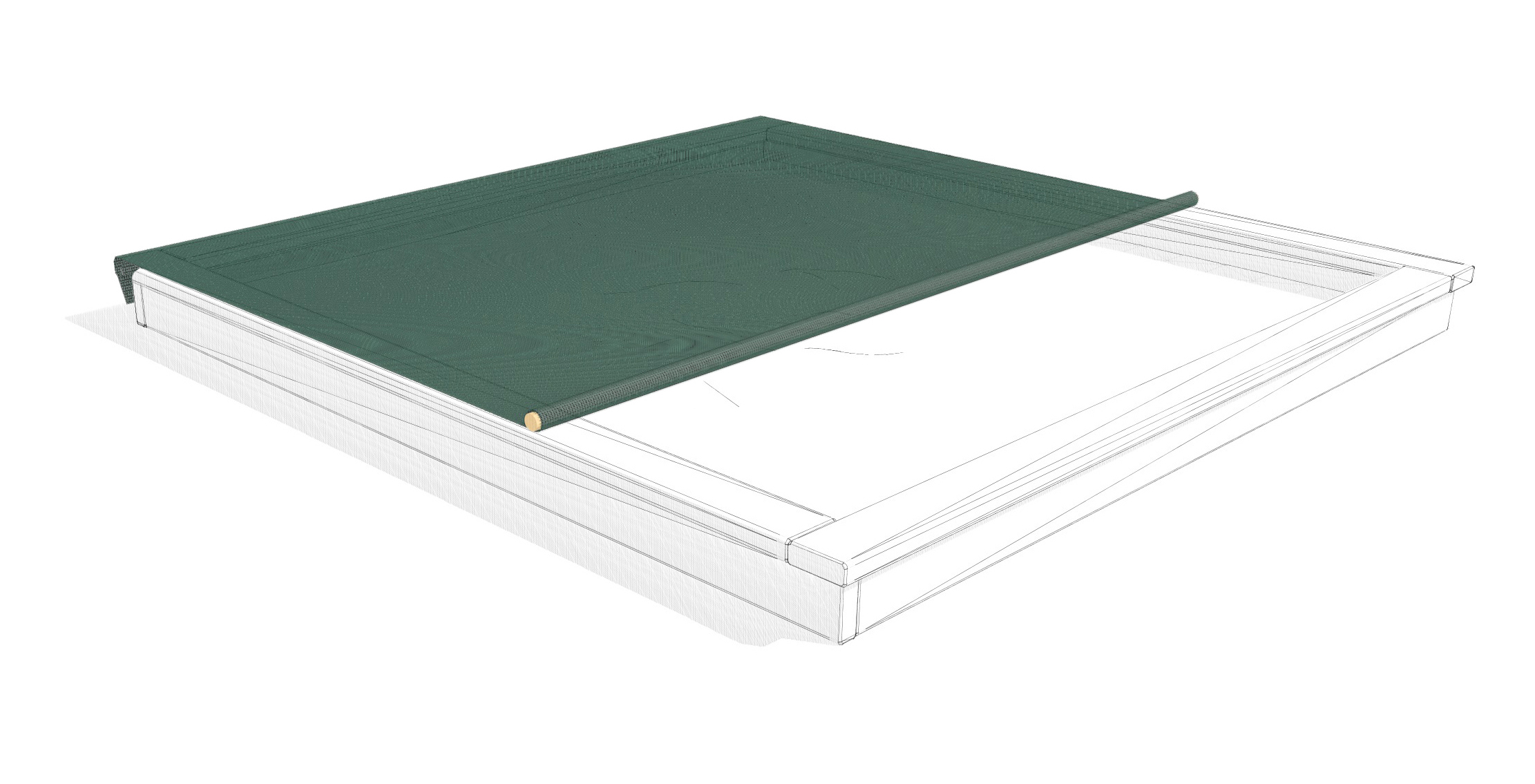 Dans la mesure du possible, les bacs à sable devraient être couverts. Une barre permet de la rouler et de la dérouler facilement. Il est également possible de tendre la bâche avec un élastique de caoutchouc fixé sur des rouleaux de fixation.