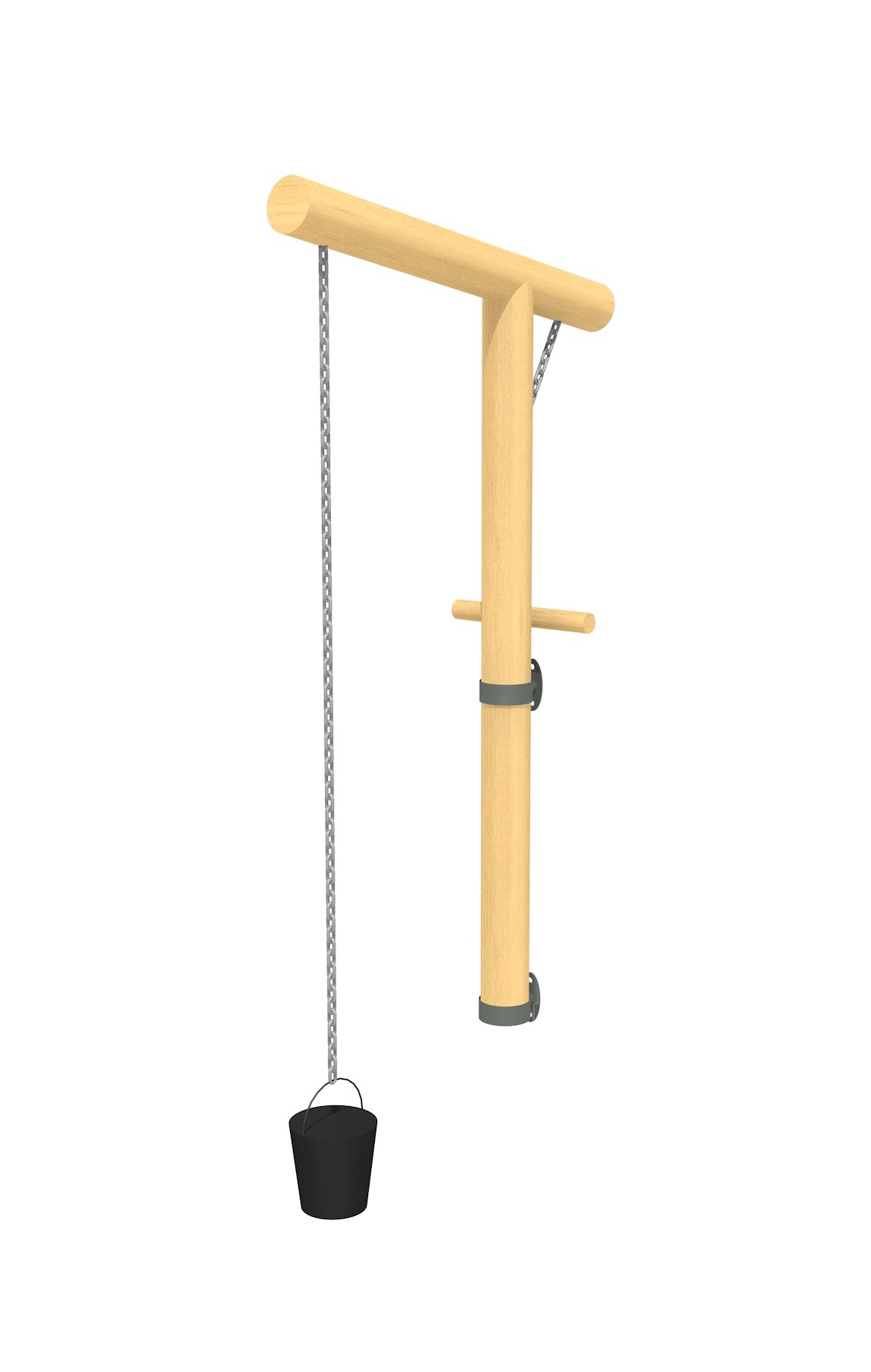 En bois de robinier massif, croissance naturelle, non traité. Chaînes de sécurité en inox.