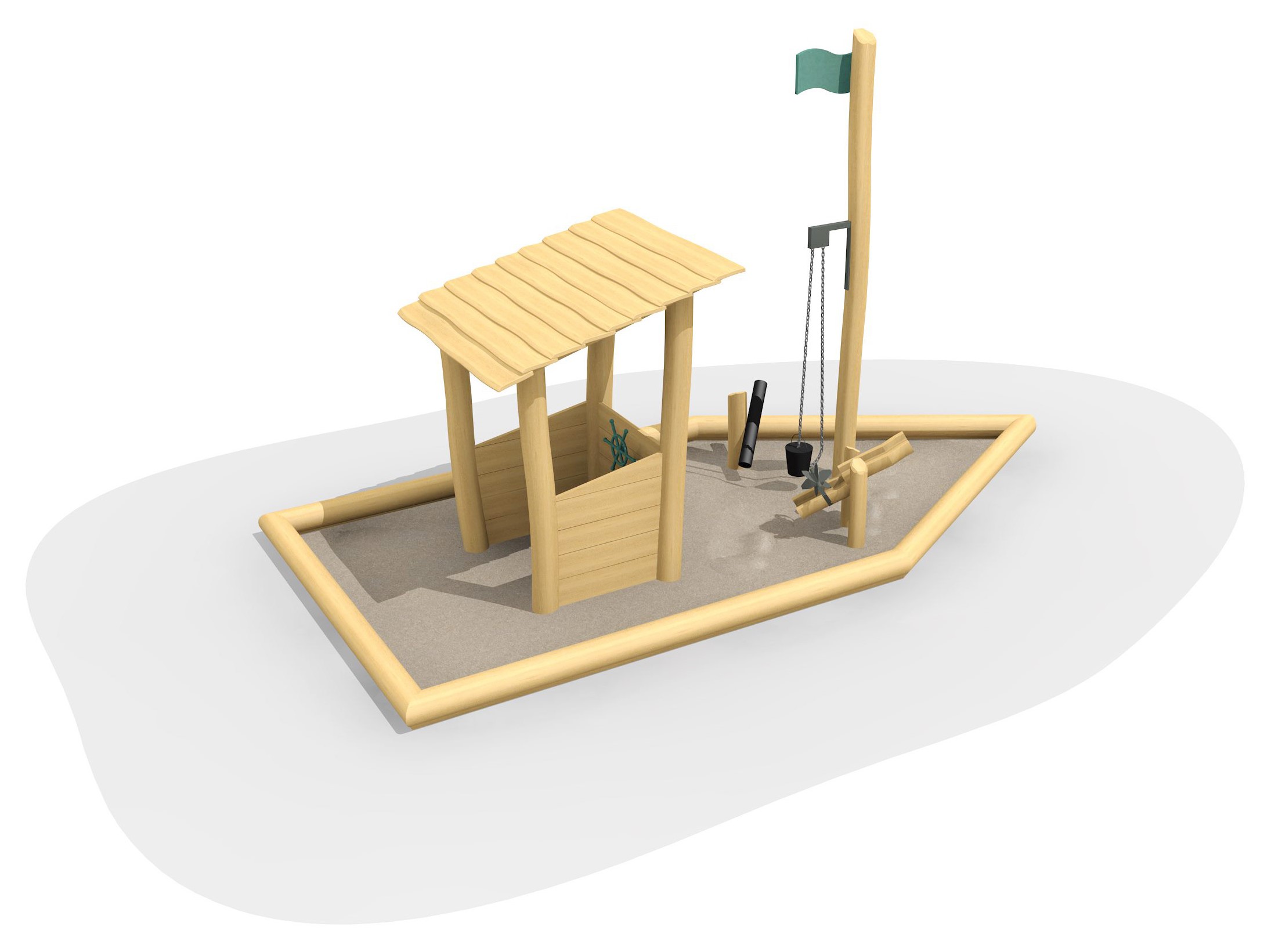 Une petite place de jeux de sable ludique et complète. Le bateau emmène les enfants vers l’aventure.