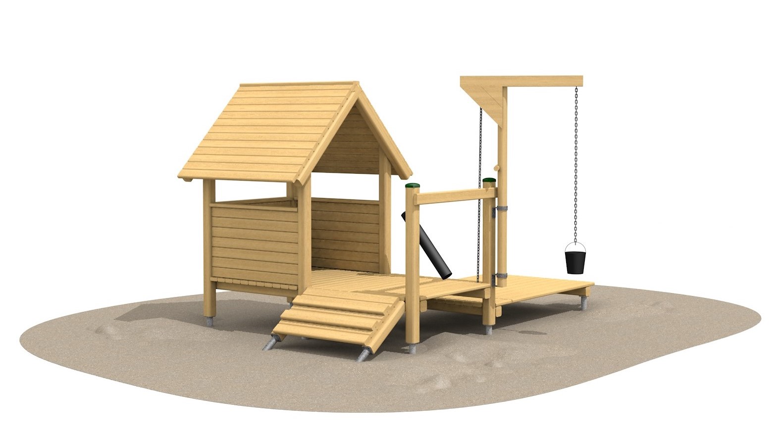 Maisonnette à sable très apréciée des petits. Chacune avec terassse, banquette, grue et déversoir, ainsi qu’une rampe d’accès très pratique. Peuvent-être combinées avec des installation d’eau.