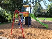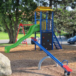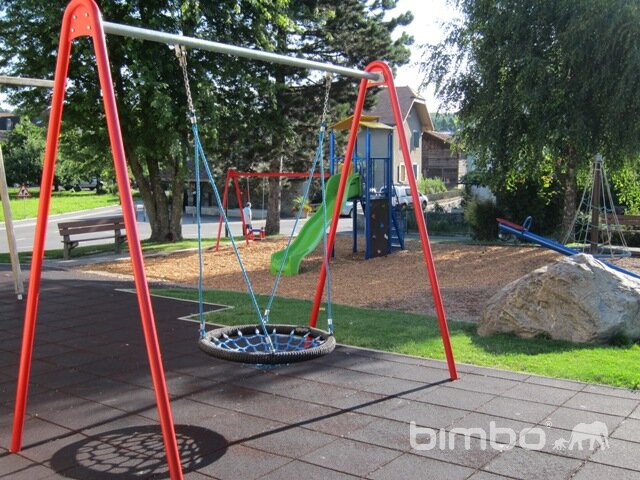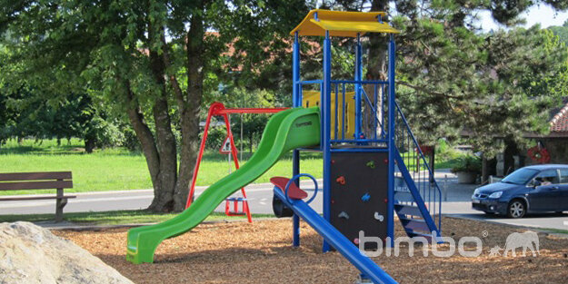 Un paysage de jeux multicolore en acier durable. Le revêtement en copeaux öcocolor contraste agréablement avec ce parc coloré. Nous fabriquons le programme complet bimbo S en bois et en acier dans nos ateliers.