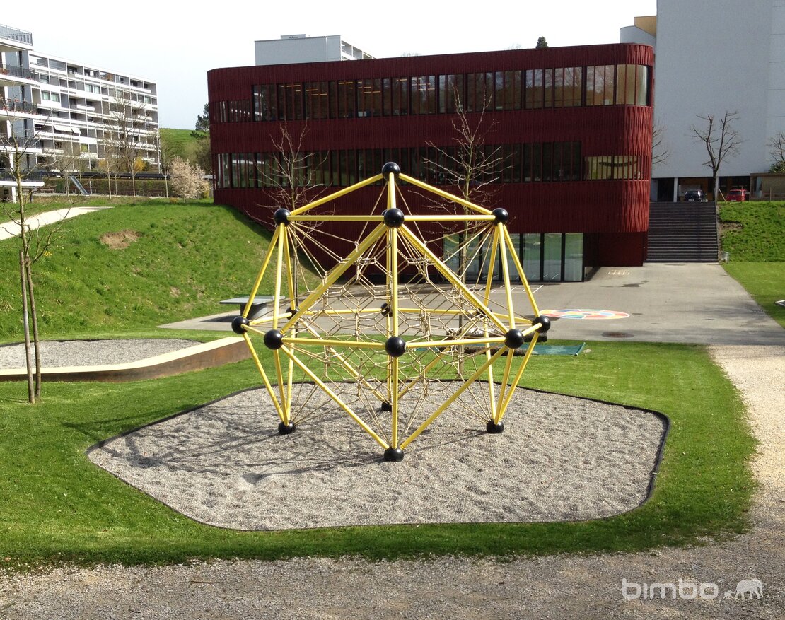 Simple, mais efficace. Les combinaisons de couleurs et les équipements de jeux ont le vent en poupe auprès de tous. Le sol amortissant consiste en gravier rond. Les contours du sol sont en caoutchouc plein