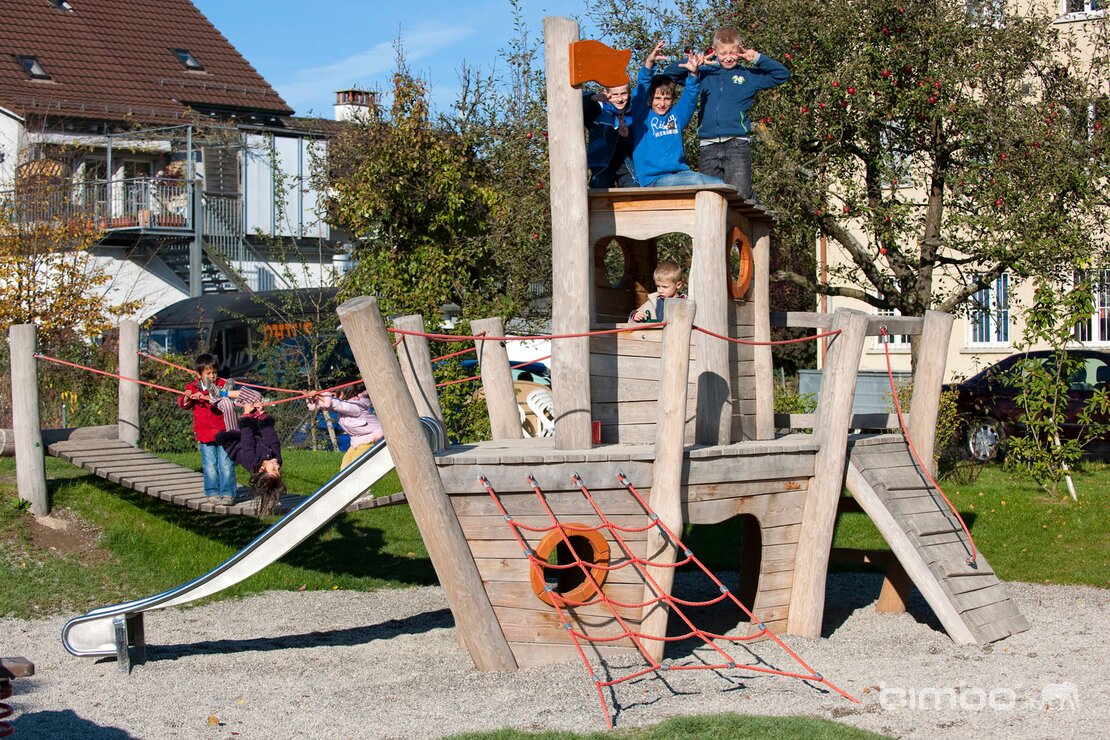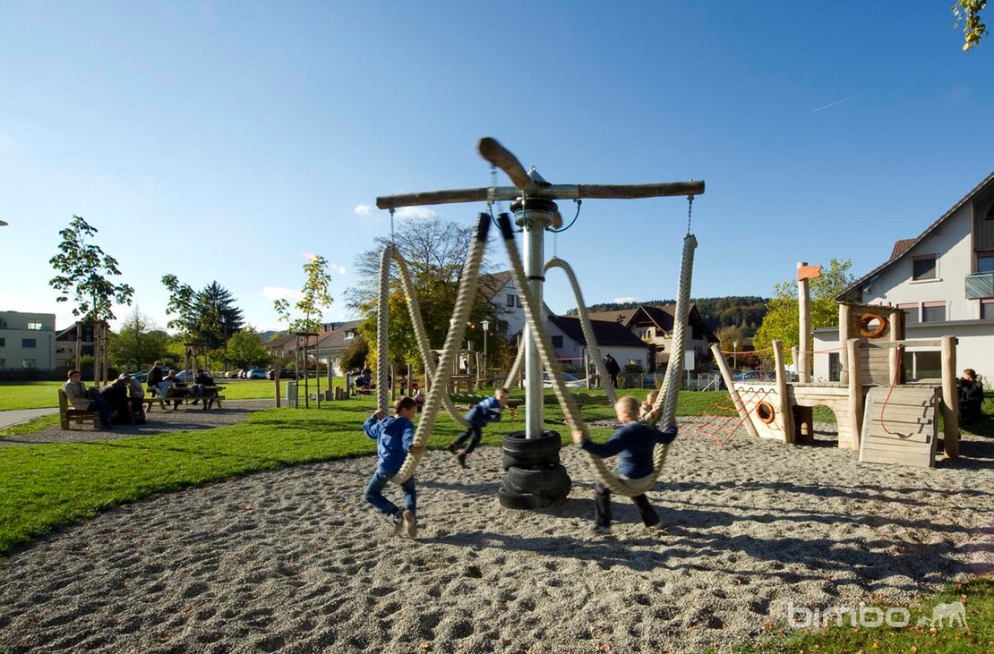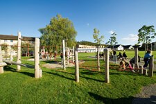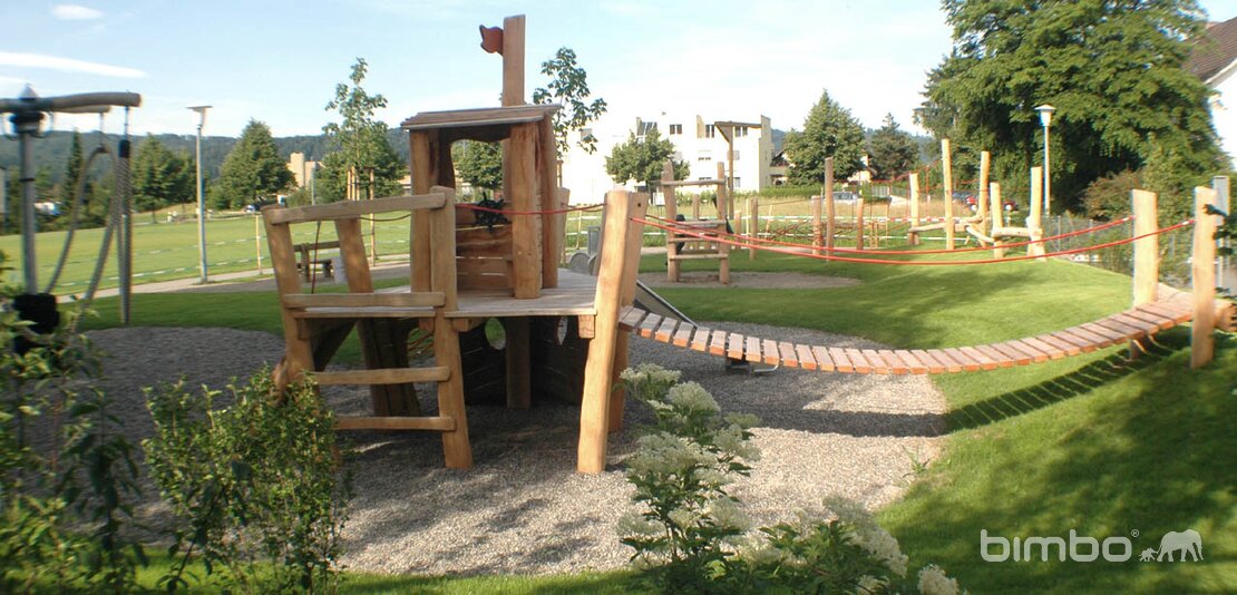 Un parc villageois qui anime à la rencontre. Des matériaux naturels et des jeux pour les petits. Le parc s'insère bien dans l'environnent rural. Des équipements de jeux bimbo nature, en robinier massif, avec revêtement de sol amortissant en gravier rond et gazon.