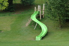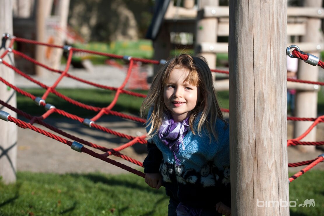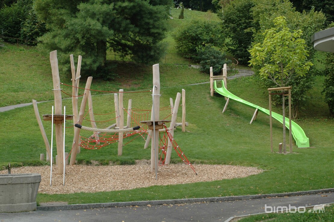 Le terrain de jeux est incorporé de façon optimale dans l'environnement. La situation en pente et le gazon n'ont pas été modifiés. Un paysage d'escalade qui présente des défis variés. Équipements de jeux bimbo nature en bois massif naturel sans traitement.
