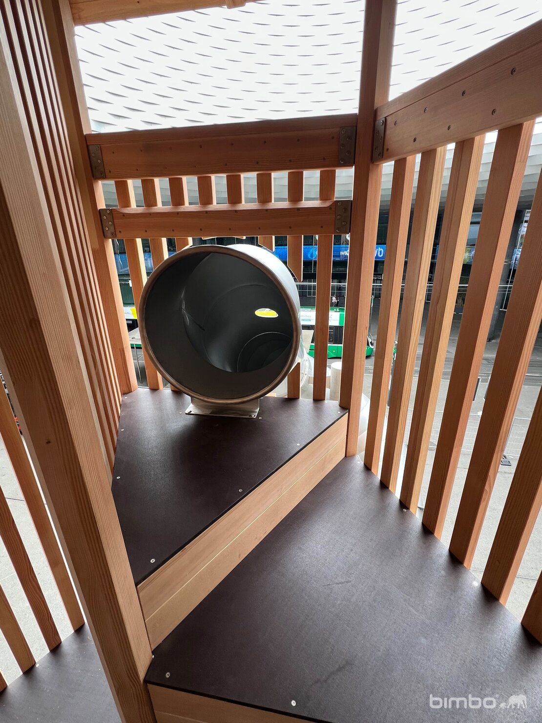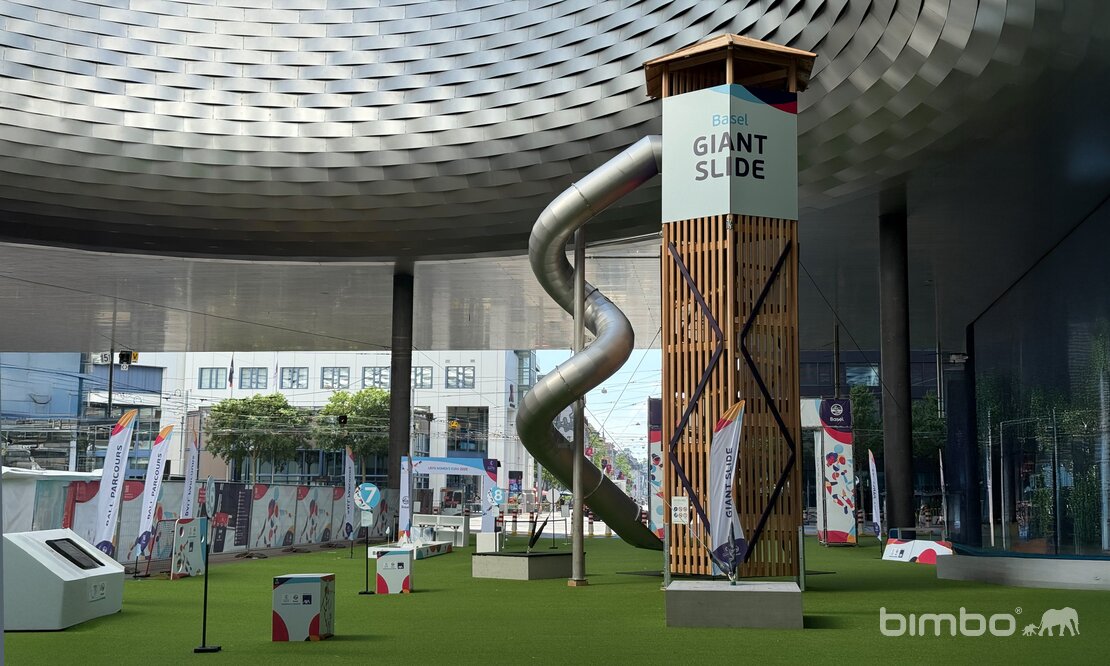 Cette tour de jeu XL d'une hauteur de 11 m et un toboggan en acier inoxydable d'environ 20 m de long a été conçue et fabriquée par nos soins à l'occasion du Women`s Euro 25. Tour en bois de conifères suisses avec toboggan en spirale en acier inoxydable.