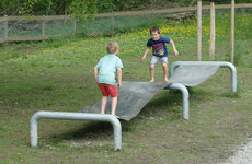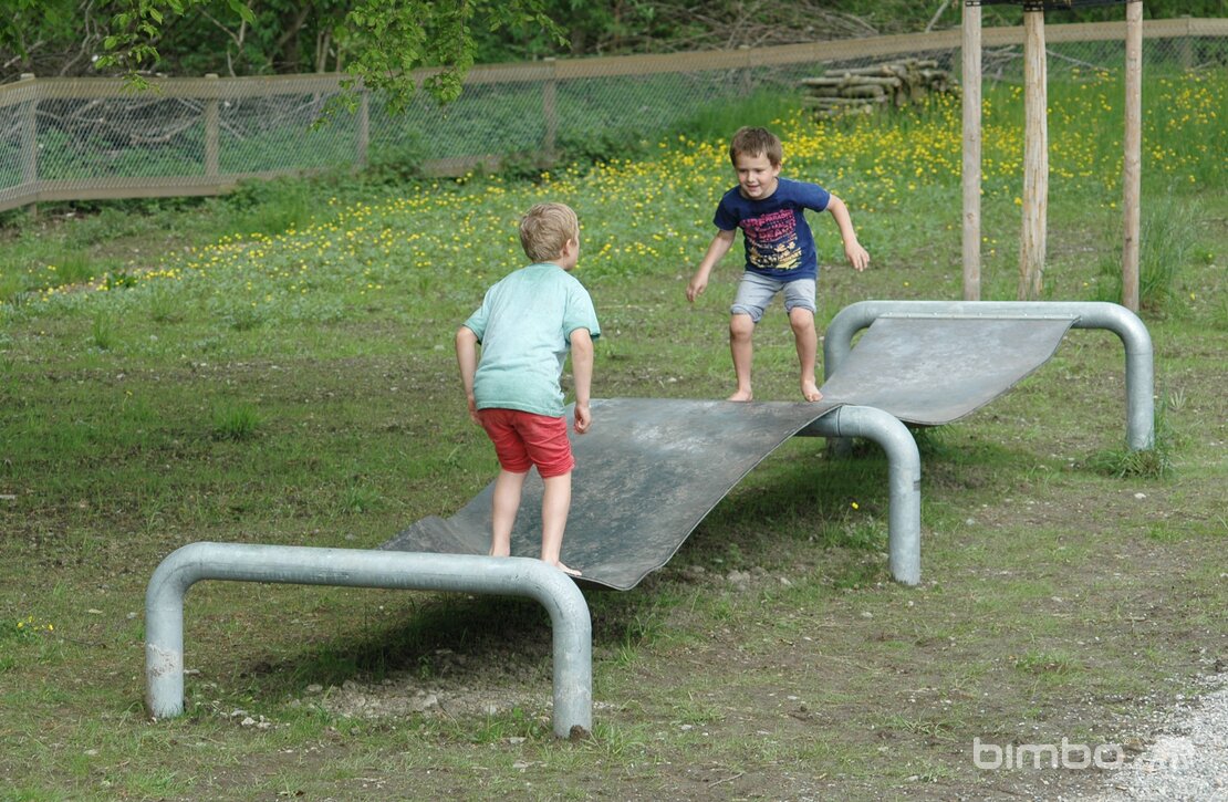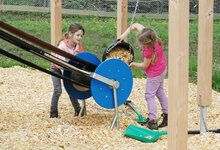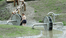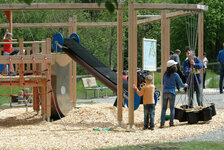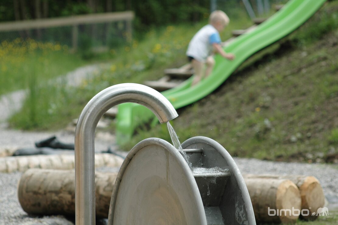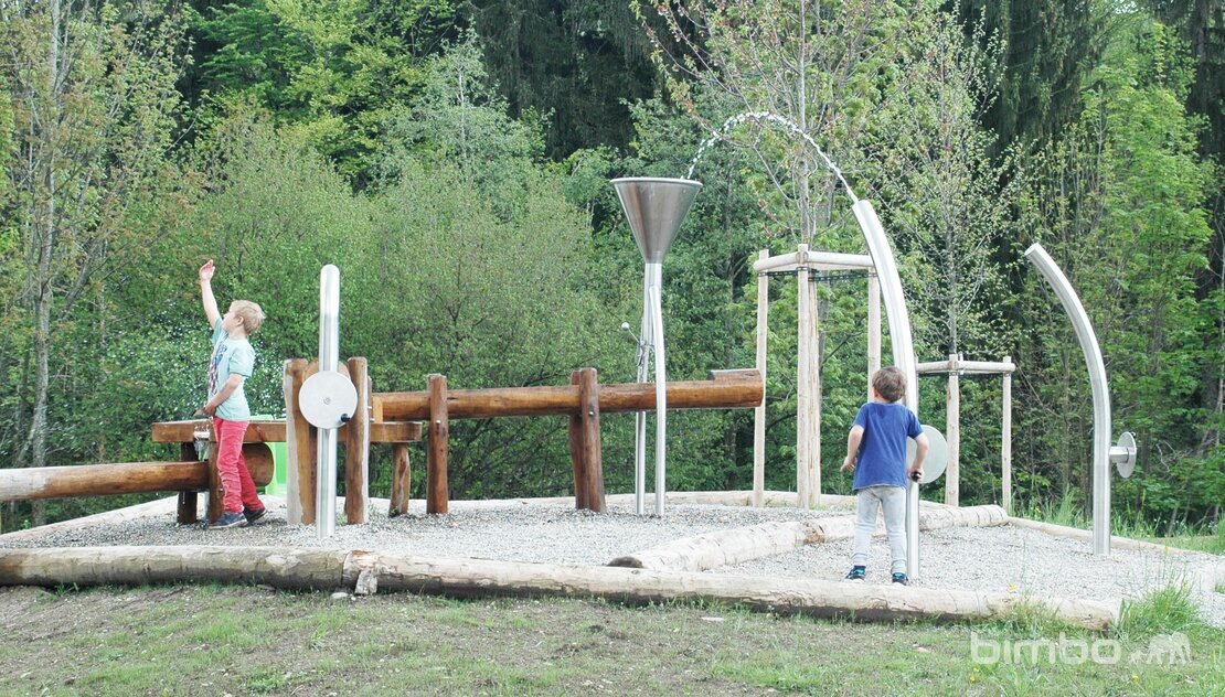 Cette aire de jeux repose sur le principe des quatre vecteurs d'énergie qui sont l'eau, le vent, le bois et le soleil. Plus il y d'enfants et plus le canal d'eau se remplit et se met en mouvement. Les jeux ont été développés en coordination avec le bureau freiraumarchitektur et construits en mélèze suisse et inox.