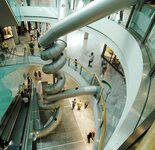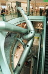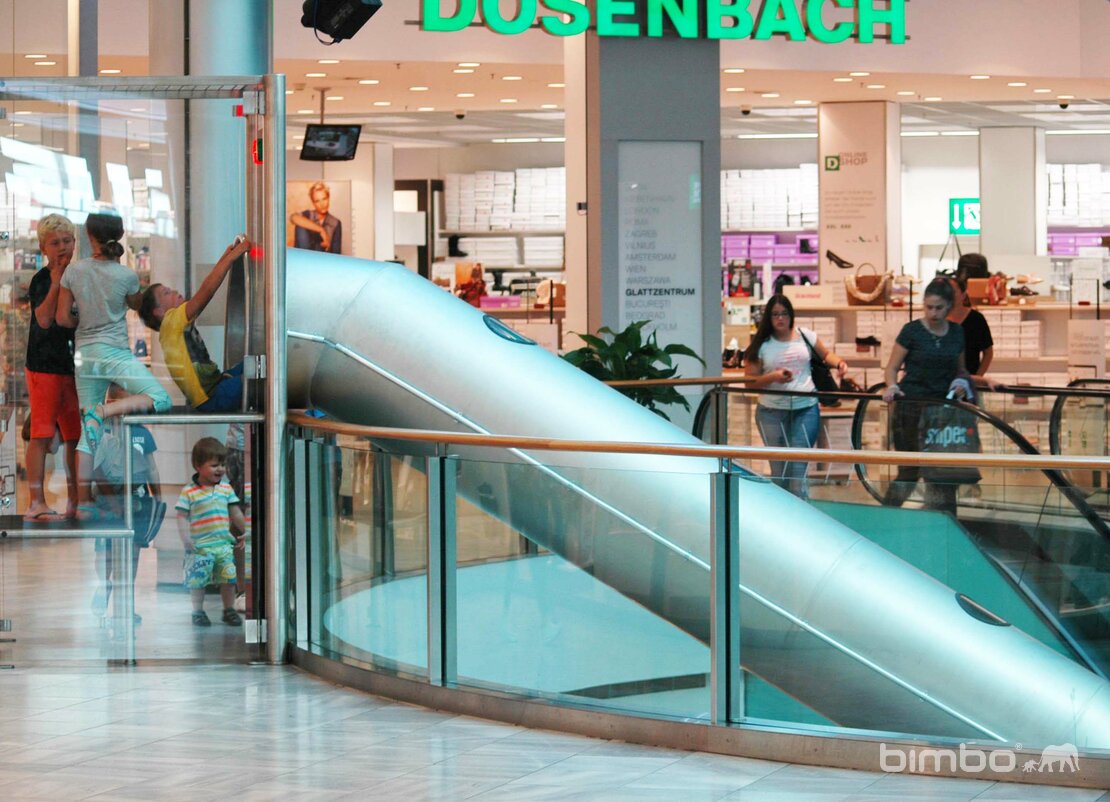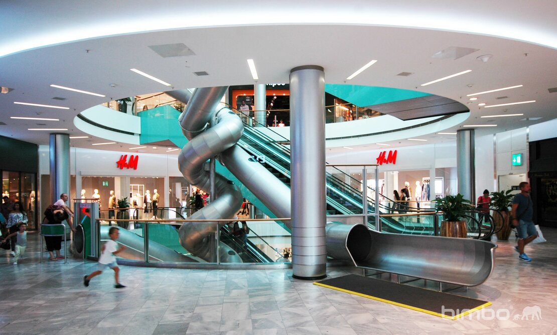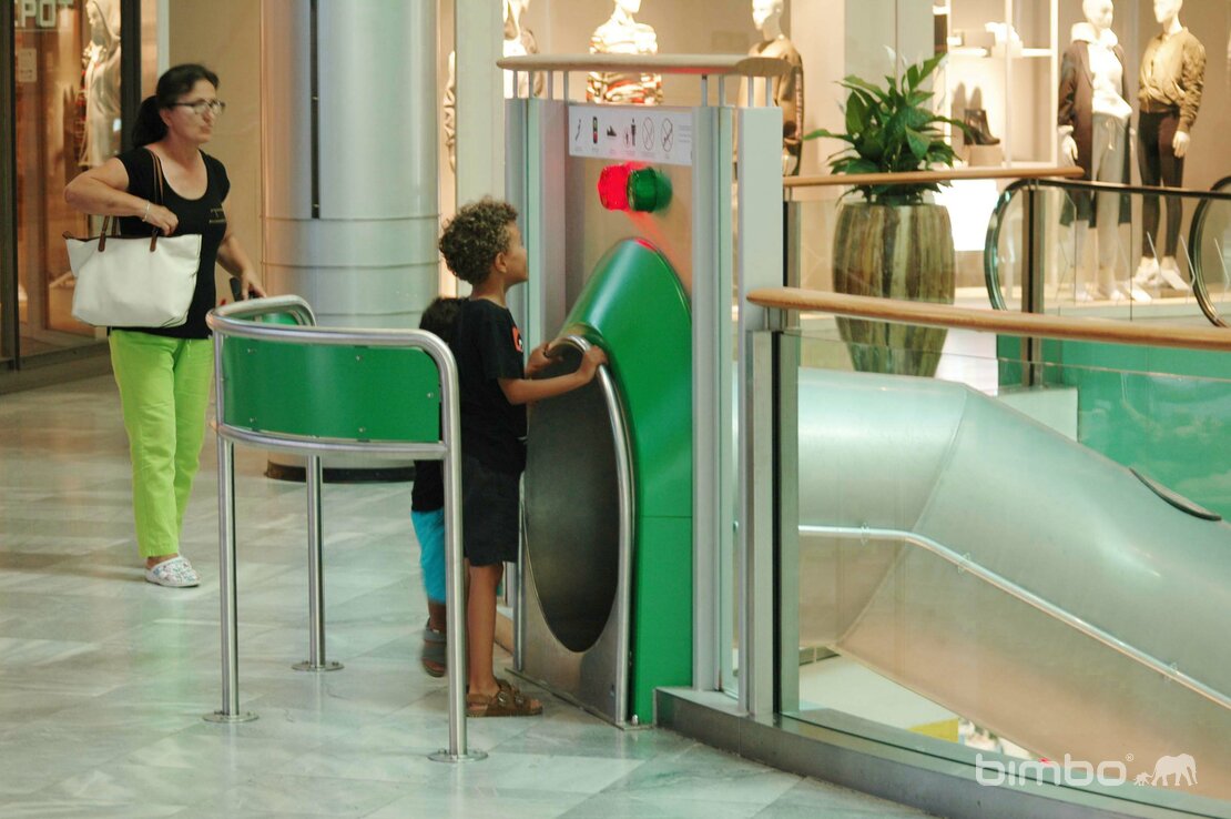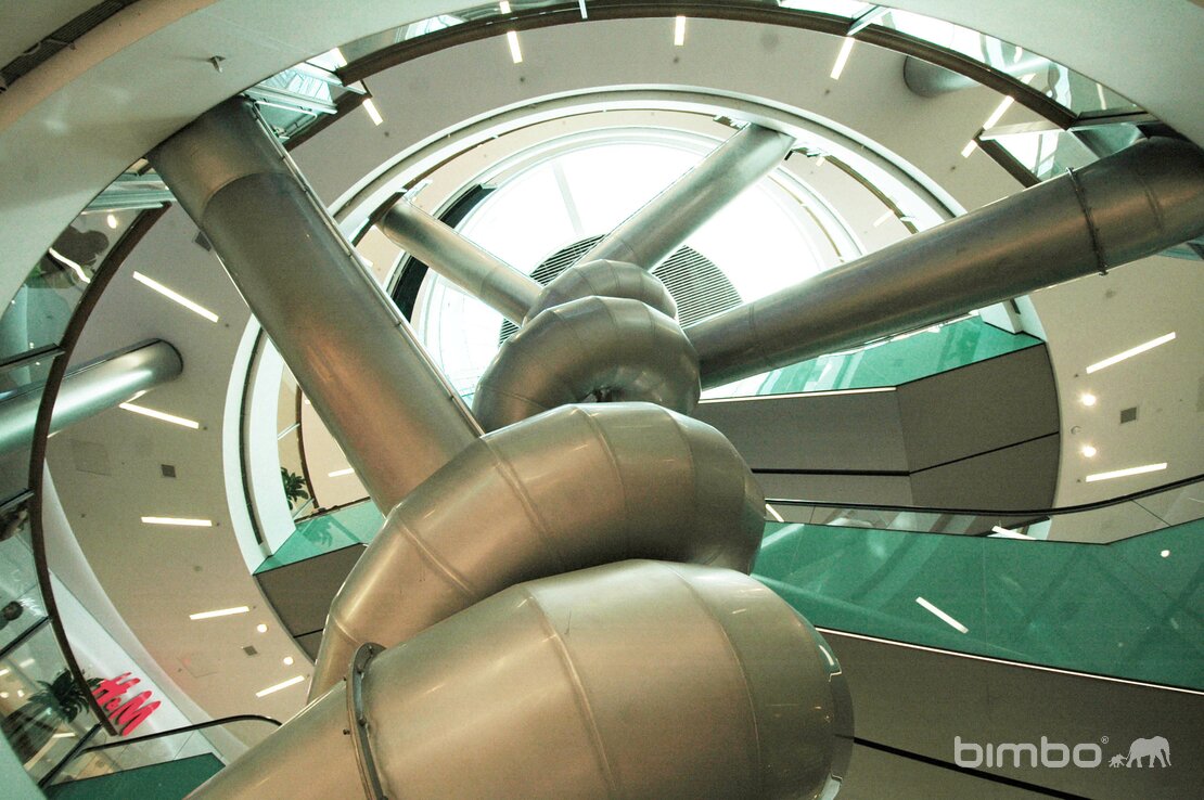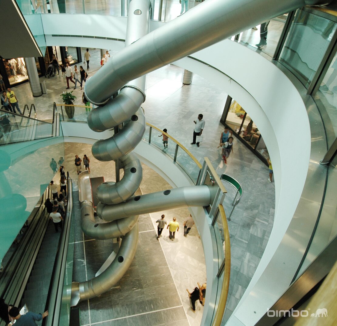 Un toboggan géant qui fait battre les coeurs des enfants et des adultes. Plaisir et frissons s'y alternent. Trois toboggans s'entremêlent et sont gérés par des feux de signalisation. Éxécution en inox avec des hublots en plexiglas. Les sorties des toboggans sont prolongées et chaque toboggan porte des repères de couleurs.