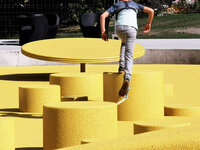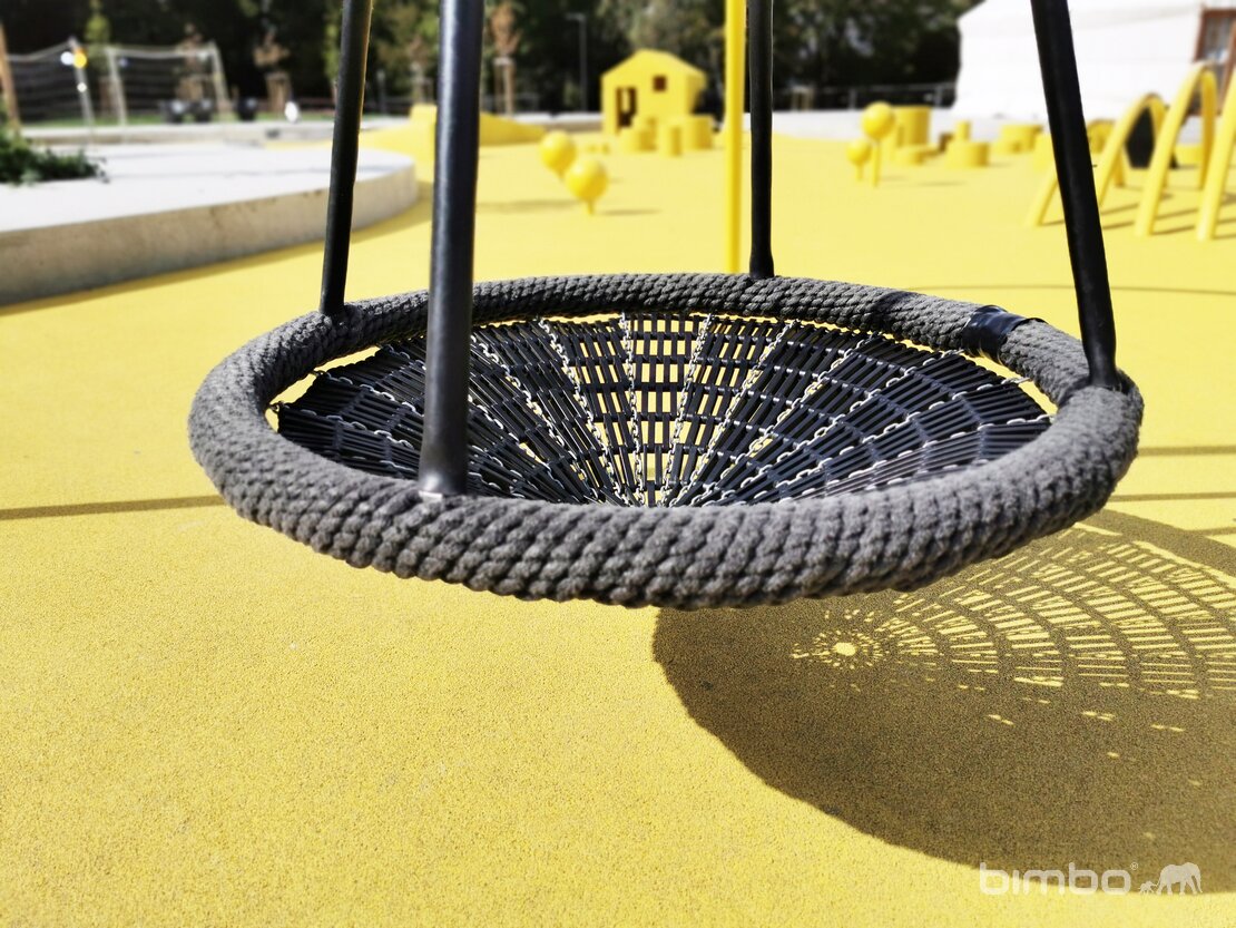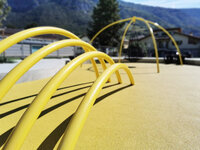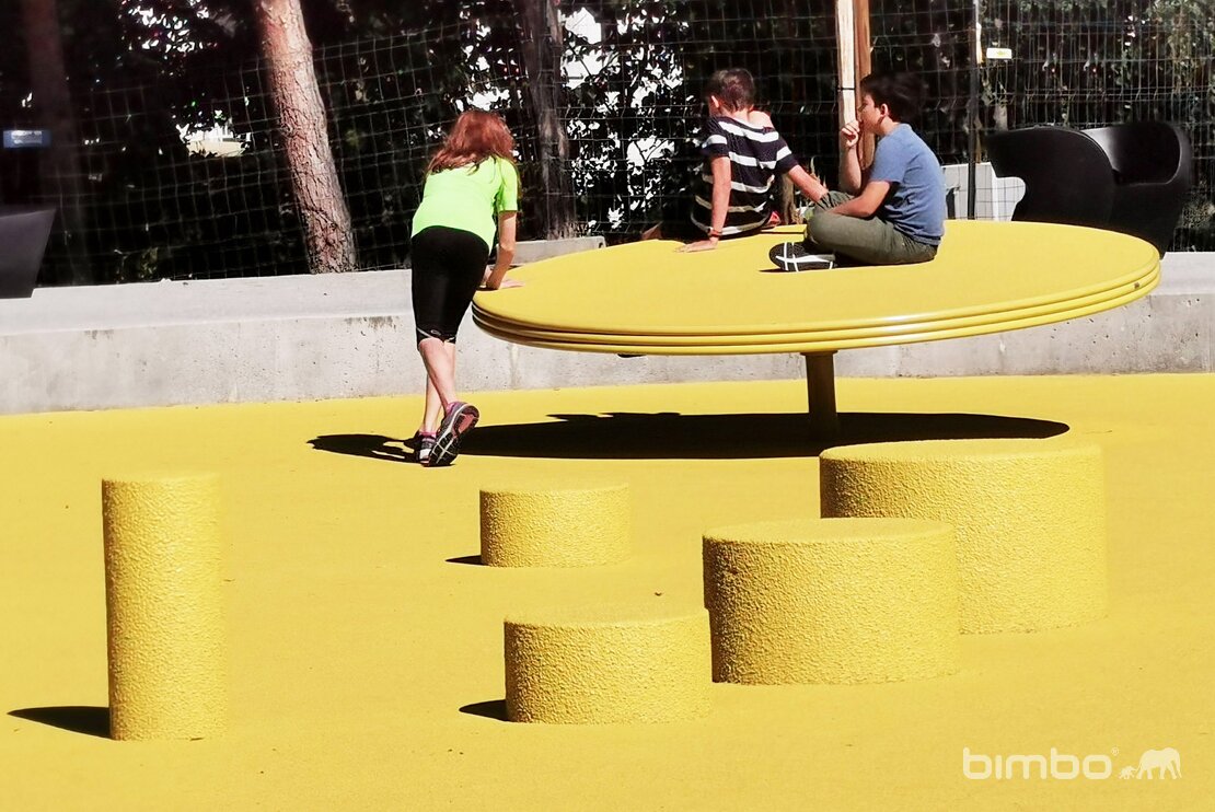 Engins et sols jaunes. Une idée audacieuse qui suscite l'enthousiasme. La combinaison des jeux plonge les enfants dans un autre monde (jaune). Jeux en acier, caoutchouc epdm et béton. Sol en caoutchouc epdm sans joints.