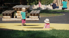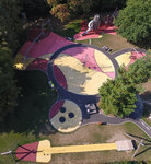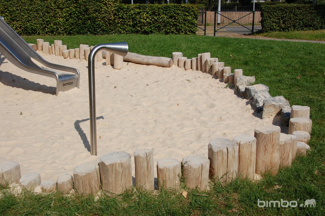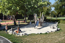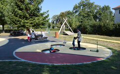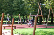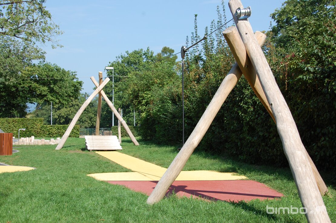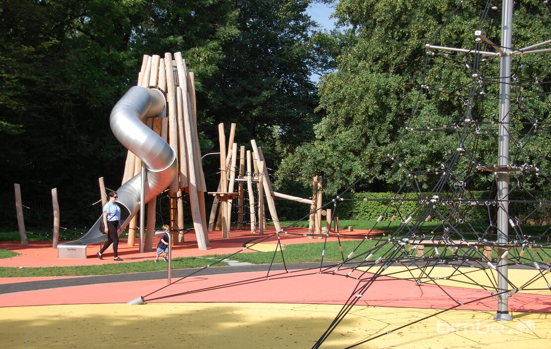 Un vaste parc avec de nombreux arbres. Il a été souhaité d'ajouter un revêtement de sol en couleurs aux équipements en bois naturel. Un projet réussi utilisé fréquemment. En bois dur durable non traité.