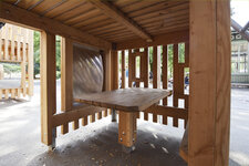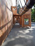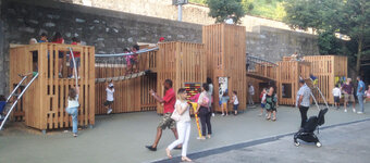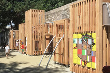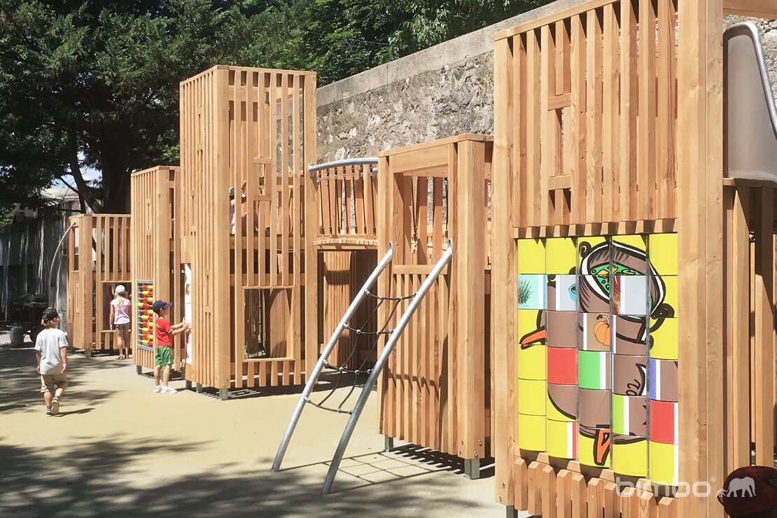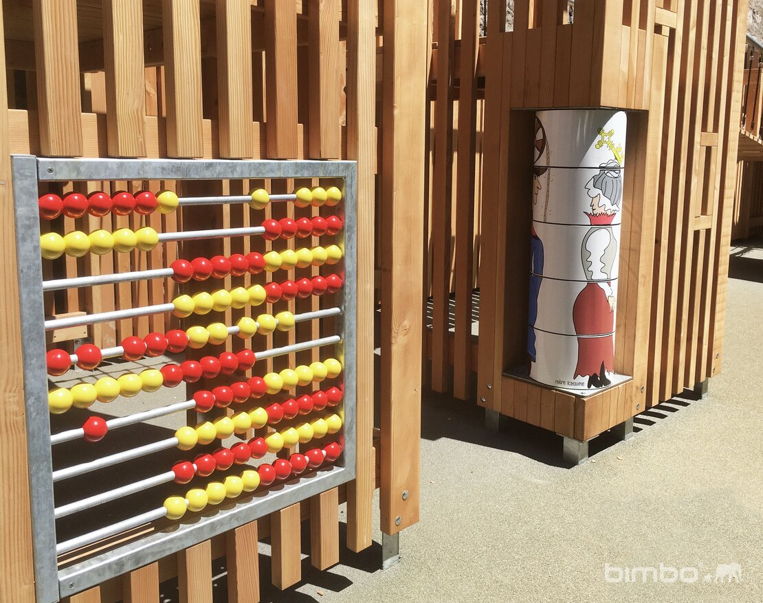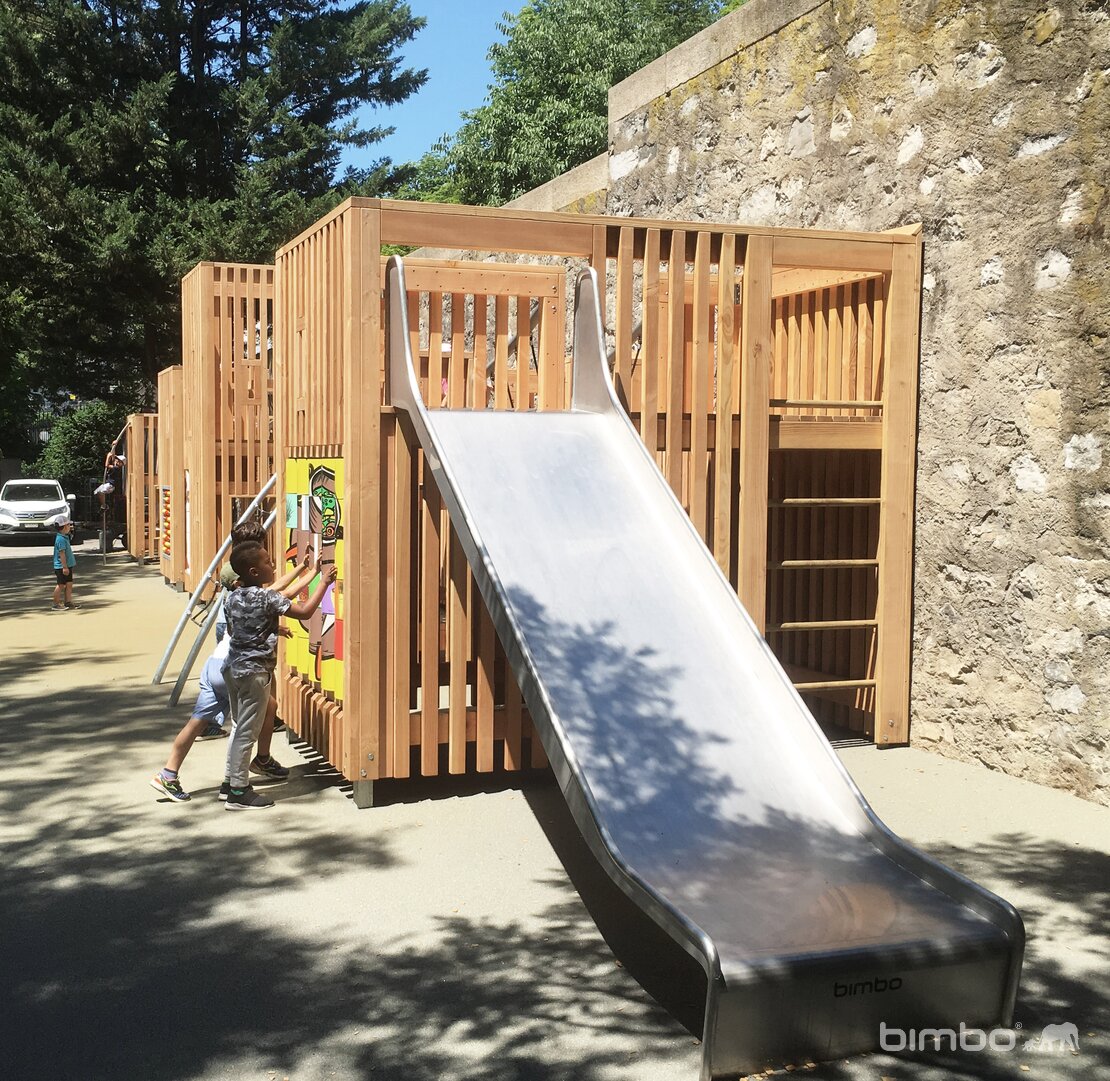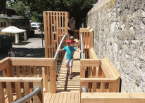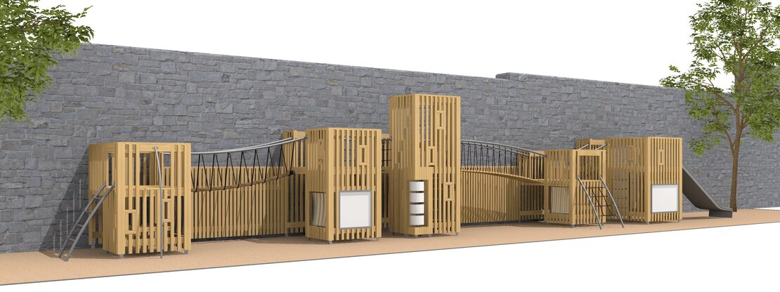 Ce jeu dans un parc genevois devait répondre à un critère visuel devant ce mur historique et en même temps être accessible aux chaises roulantes. Ce concept réussi offre de nombreuses possibilités. Le tout a été réalisé en bois de conifère Suisse.