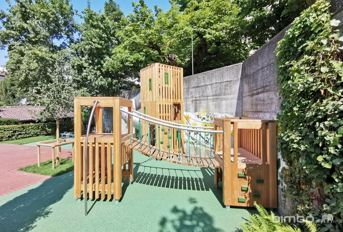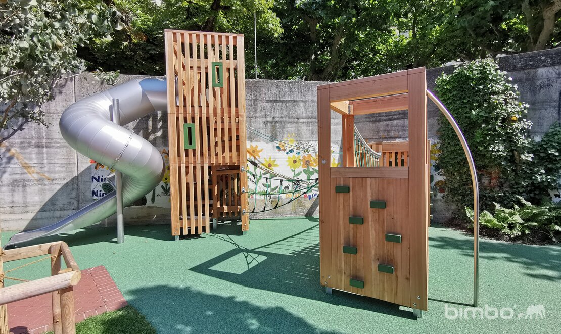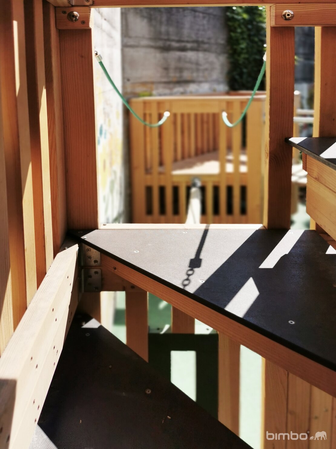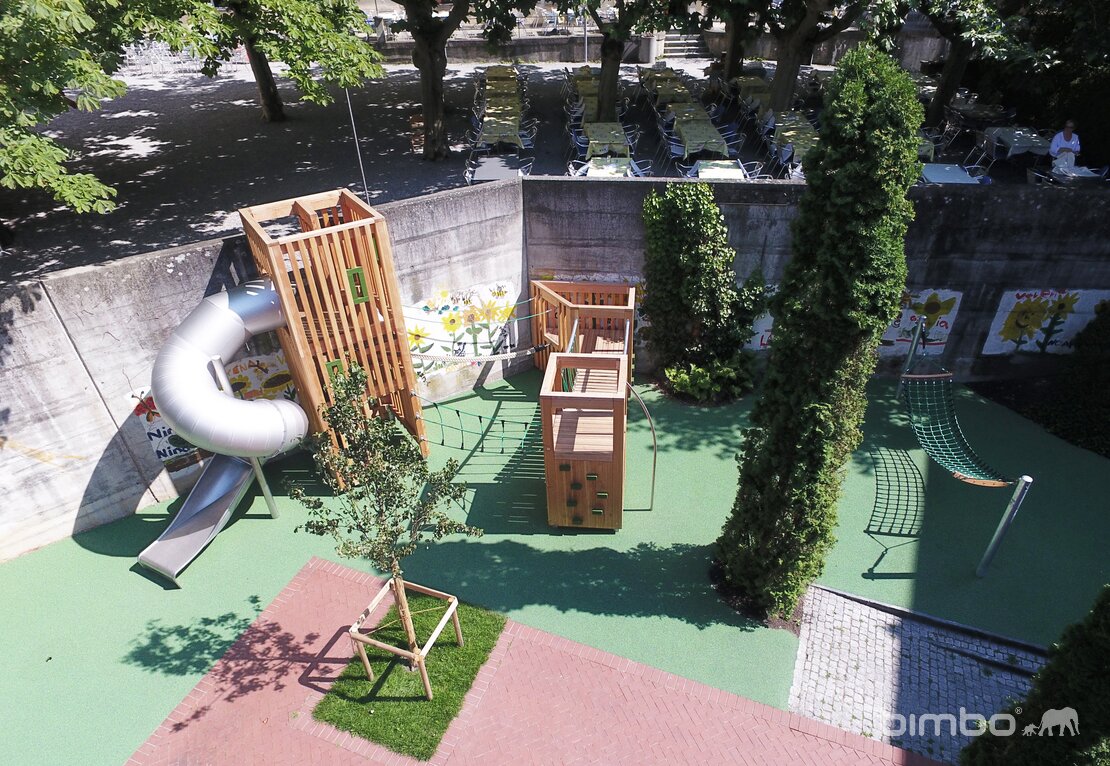 Une adaptation de notre gamme bimbox permet de proposer beaucoup de jeu sur une petite surface. L'intérieur de la tour est un escalier d'accès pour la terrasse du restaurant, fermée par un portail. Exécution en bois de douglas indigène. Parties métalliques en métal galvanisé et inox.
