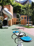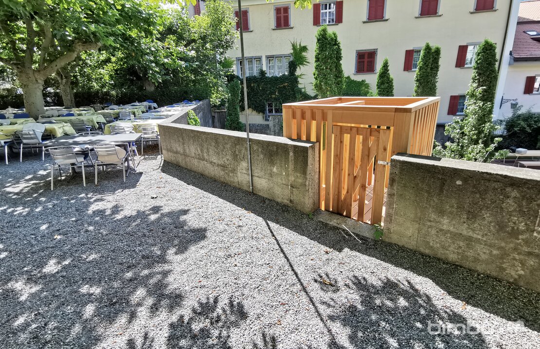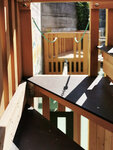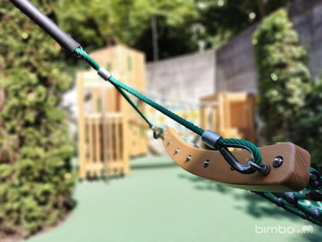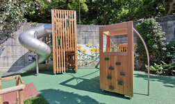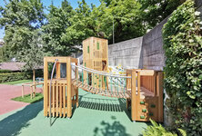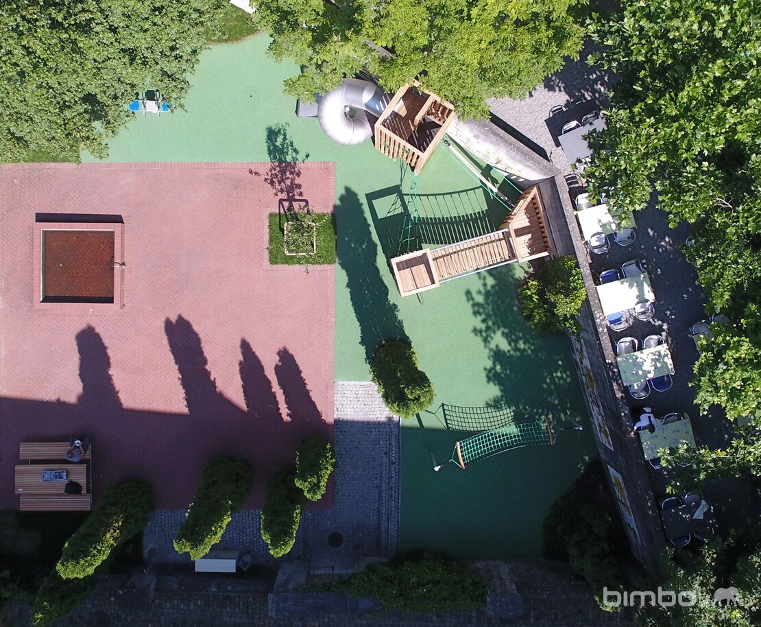 Une adaptation de notre gamme bimbox permet de proposer beaucoup de jeu sur une petite surface. L'intérieur de la tour est un escalier d'accès pour la terrasse du restaurant, fermée par un portail. Exécution en bois de douglas indigène. Parties métalliques en métal galvanisé et inox.